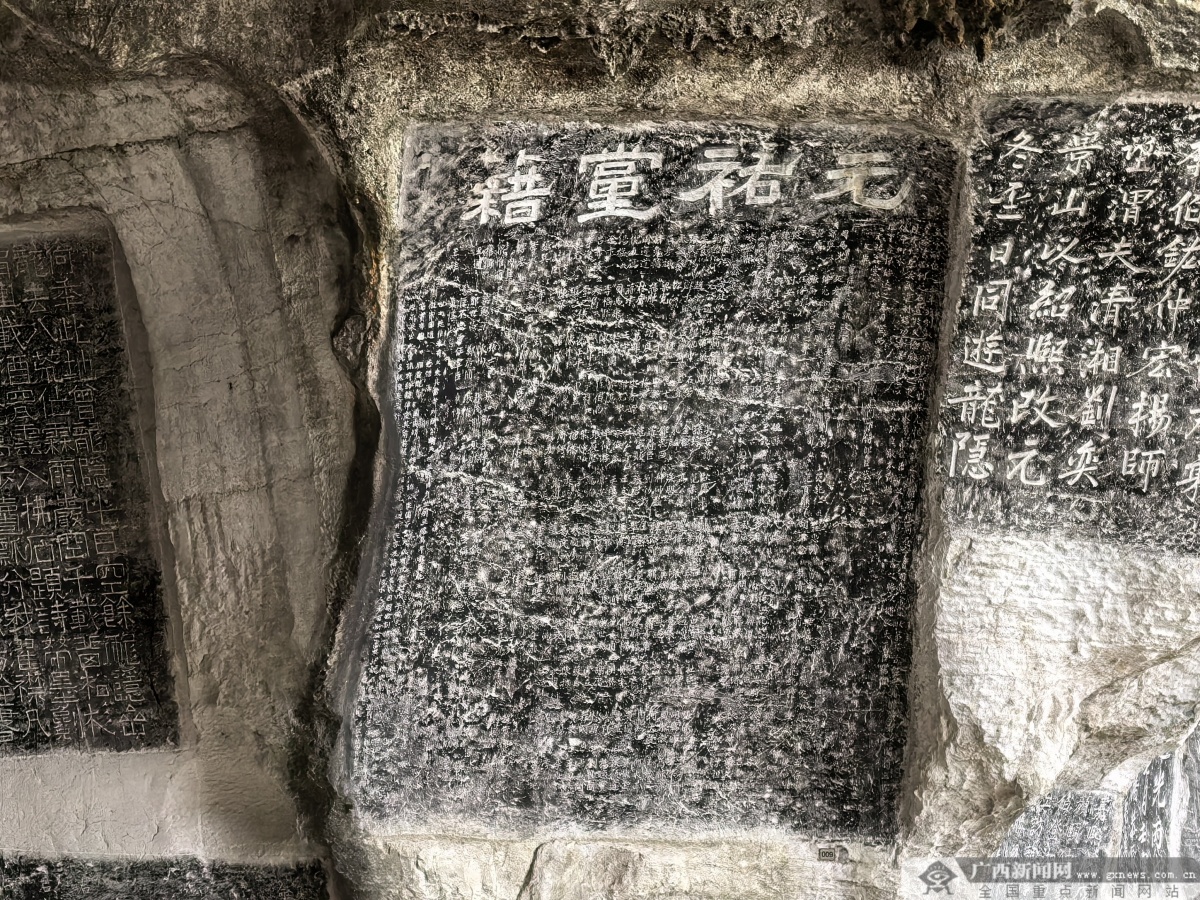 龙隐岩摩崖石刻全景。 广西的摩崖石刻分布广泛,以桂林地区最为密集,呈现出“核心集聚、多点辐射”的格局,承载着丰富的历史信息和文化内涵,对于了解古代社会、经济、文化等方面具有重要价值。 唐宋时期,岭南在中原传统认知中属蛮荒瘴疠之地,常被朝廷作为贬谪官员的安置之所。此后的漫长岁月里,历朝历代的文人士大夫登览八桂的奇山秀水,触景生情,随性而题,顺势而刻,最终形成了“唐宋题名之渊薮,以桂林为甲”的石刻大观。清代金石学家叶昌炽在《语石》中曾如此记载桂林的胜景:“题名赋诗,摩崖殆遍”“诸山无一处无摩崖”,足见桂林石刻风气之盛。 “摩崖石刻不仅是古代文化的艺术表达,更蕴含了丰富的文化意蕴,彰显了古人的智慧与创造力。”柳州市军事博物园副主任肖圣军表示,研究这些石刻,对于广西文化的继承与发展有着深远的意义。桂林七星岩的《金刚经》节选,阐释着佛教的哲理与对自然的敬畏;玉林容县都峤山的道教石刻,是岭南道教文化的重要遗存;南宁邕宁雷婆岭的清代石刻群,记录着壮族的民俗风情;来宾金秀帽合山的岩画,展现着瑶族的祖先崇拜……崖壁为纸,山水为墨,数千处摩崖石刻,共同构成了广西历史文化的石质档案,为研究古代政治、文化、艺术、民族等相关历史提供了珍贵的实物资料。 这些绵延千年的石刻,记录了八桂大地的历史变迁与人文风骨,既是我国南方摩崖石刻体系的核心组成,更是中原文化与岭南文化交融的直接见证。 石上春秋 刻在崖壁上的时代史书 不同的石刻,承载着不同的时代印记。纪功记事、文人题咏、宗教传播、民族表达,每一道刻痕,都藏着一段鲜活的历史。 在广西的众多石刻中,有两方全国仅存的宋刻“元祐党籍碑”,弥足珍贵。北宋徽宗崇宁年间,权臣蔡京以推崇新法为名,将司马光、苏轼、黄庭坚等309位反对新法的朝野人士定为“元祐奸党”,诏令全国刻石公示,碑上之人永不录用,其子孙不得参加科举——这就是“元祐党籍碑”。后来宋徽宗察觉不妥,于是下诏毁碑。虽然原碑早已无存,却有民间人士悄悄根据拓片重刻,将这份“黑名单”留存了下来。