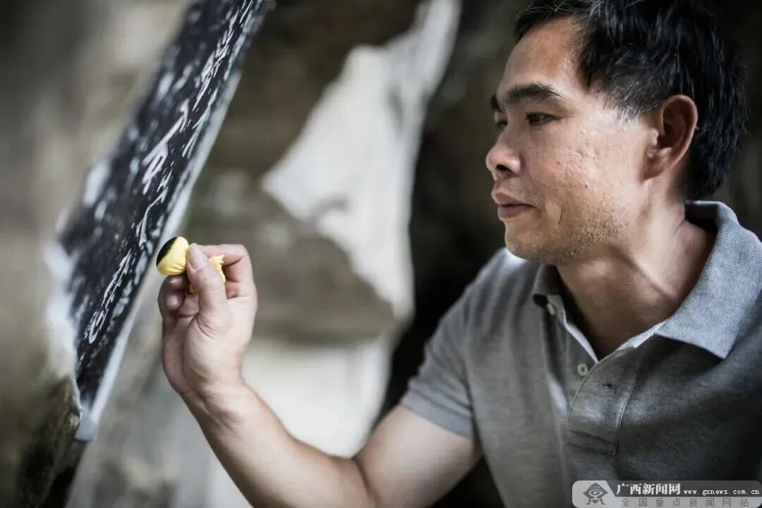工作中的韦可祥。图源桂海碑林博物馆 为了做好这份工作,他在实践中摸索出了一套适用于石灰岩石刻的传拓技法。随着老一辈传拓师傅们陆续退休,传拓工作的重任落到了韦可祥的肩上。他告诉记者:“桂林石刻传拓技艺历经几代人努力探索,手工传拓采集拓片,仍然是完整保存石刻历史信息不可替代的方式。” 2012年,韦可祥参加国家图书馆举办的传拓技艺交流会,其间与“大国工匠”李仁清就高浮雕摩崖石刻采拓技术进行了深入交流。回到桂林后,他便着手对桂林摩崖造像进行系统化拓片采集,填补了桂林摩崖石刻造像没有拓片的空白。 桂海碑林博物馆馆员刘清华告诉记者,尽管摩崖石刻保护工作不断取得突破,但从长远来看,仍面临着“资金投入不足、公众认知度低、专业人才匮乏”等问题。韦可祥也表示,“人才培养周期长,是拓印技艺传承面临的主要困境。因为每块摩崖石刻都不一样,必须积累足够的经验,才能做好这份工作。”