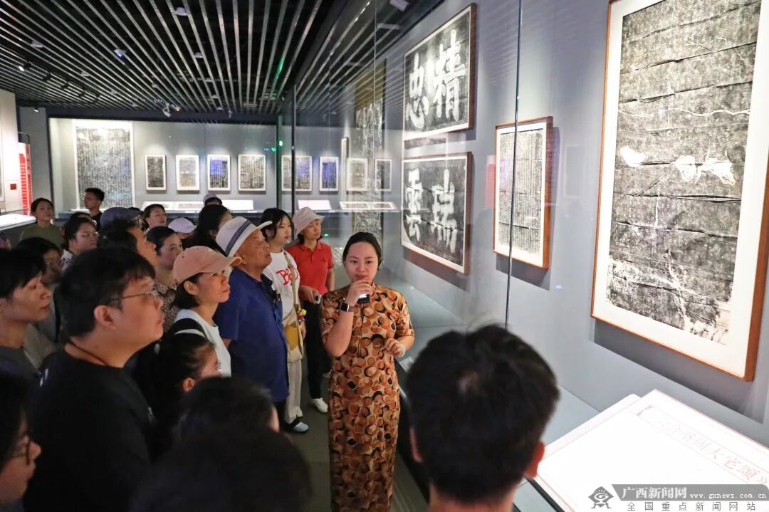 广西博物馆策展人高梦然向观众讲解拓片展品。图源广西博物馆 广西的美丽山水令人流连不已,大大激发了历代文人发“朋友圈”的热情,因此在这里留下了大量题刻。唐宋时期,柳宗元、李渤、黄庭坚、张孝祥、范成大、米芾等名流雅士陆续来到桂林,兴文讲学,登游纪胜,镂石为记,此风尤以宋时为甚。前人的石刻启发着后人的灵感,一代又一代人在山水间续写着自己的印记,最终让山水、诗文、书法,共同构成了独属于桂林的文化景观。