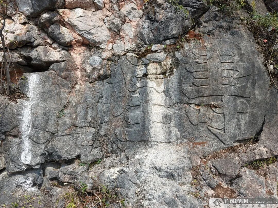 刻在山崖上的“寿星山”三个大字,经过清理后显露出来。图源桂林市融媒体中心 经桂林市文物保护与考古研究中心专家实地勘察,这方名为“寿星山”的石刻,为明嘉靖甲午年(1534年)的阳刻作品,距今已有492年历史。专家最终确认,这方石刻宽4.3米、高2.3米,一举刷新了桂林石刻相对高度最高、阳文字幅最大的两项纪录。 这个意外的发现,再次将人们的目光引向了八桂大地上那些镌刻在崖壁间的千年印记——摩崖石刻。 崖壁抒怀 天人合一的文化遗存 如今人们游山玩水,总爱用相机定格山水,在社交平台分享旅途的心情。而千百年前,没有相机与网络的古人,只能将自己的所见所感、所思所想,一笔一划刻进天然的崖壁山石间,用摩崖石刻抒发胸臆,与后来者作精神上的交流。