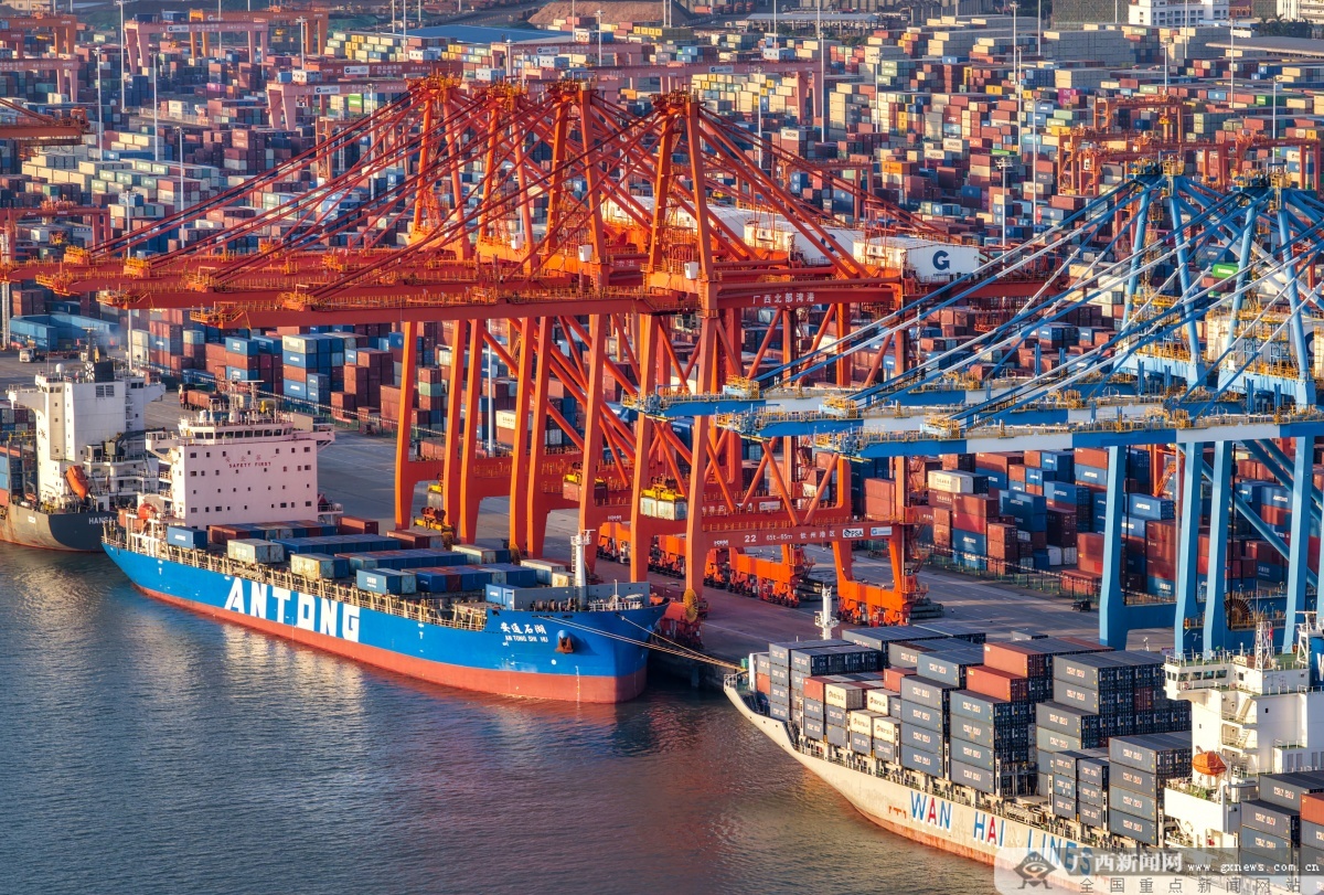 一艘集装箱巨轮正缓缓靠泊钦州港集装箱码头。广西云-广西日报记者 周军 摄(资料图) 西江黄金水道的提质升级,为“江铁海联运”新模式注入强劲动能,让江海联动的融合效应持续释放。“十四五”期间,贵港二线、西津二线、红花二线3座船闸建成通航,3000吨级船舶可从南宁直达粤港澳大湾区。春节9天假期,长洲水利枢纽船闸作业不停歇,累计通过货物240.22万吨,节后首个过闸高峰如期而至,却无船舶滞留,西江航运干线通行效率正不断提升。 物流通道的完善,进一步推动了制度机制持续创新。3月18日,贵港“湾港通”多式联运模式落地,实现了物流通道与制度机制的双重突破,企业在本地即可一站式完成通关全流程。“以前我们做外贸,要跑到香港、广州通关,物流成本高、还箱不便,现在‘湾港通’实现了‘一次申报、一单贯通’,物流成本降低10%—25%,通关时间节省了2天!”贵港一家外贸企业负责人表示。