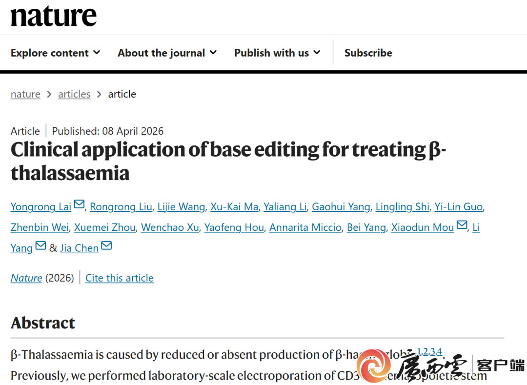 (小编先坦白:8个英文单词,一大半都不认识……) 别急,专家来划重点: 这是全球首个碱基编辑药物治疗输血依赖型β-地中海贫血的临床应用结果,也是我国地贫领域临床研究第一次登上《Nature》杂志! 标志着中国原创基因编辑技术,获得国际权威认可! 为啥是广西? 因为广西是地贫高发区,地贫基因携带率高达20%以上,给无数家庭和患者带来了沉重负担。 可能有人还不清楚,β-地中海贫血是由β-珠蛋白基因缺陷导致的遗传性溶血性疾病。其中,输血依赖型患者需要终身规律输血,不仅要面临血源短缺的难题,还可能出现铁过载等风险。 目前,异基因造血干细胞移植是有效的根治方法,但配型太难,还可能出现移植物抗宿主病等严重风险,很多患者无法获得根治的机会。 新希望来了!基因编辑技术破局。 好在,基因编辑技术的发展,给地贫患者带来了治愈的新路径! 广西医科大学第一附属医院介绍,该院团队利用一种叫变形式碱基编辑器(tBE)的基因编辑技术及基于该技术开发的CS-101注射液,来治疗β-地中海贫血患者。 简而言之,不用切断患者的DNA双链,直接精准改写特定碱基,就能实现精确编辑,提高治疗的安全性。