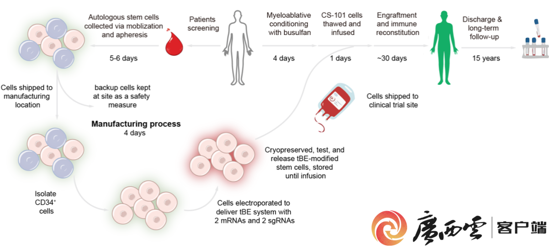 CS-101治疗疗程。广西医科大学第一附属医院供图 临床试验结果超惊艳! IIT临床试验结果显示: 5名β-地中海贫血患者接受治疗后,造血功能快速重建; 总血红蛋白和胎儿血红蛋白(HbF)水平迅速提升; 全部成功摆脱输血依赖; 更厉害的是,首例患者脱离输血已经超过28个月,临床效果显著! 一句话总结: 这项疗法为遗传性血液疾病的治愈,打开了一扇全新的大门。 广西科研,牛! |