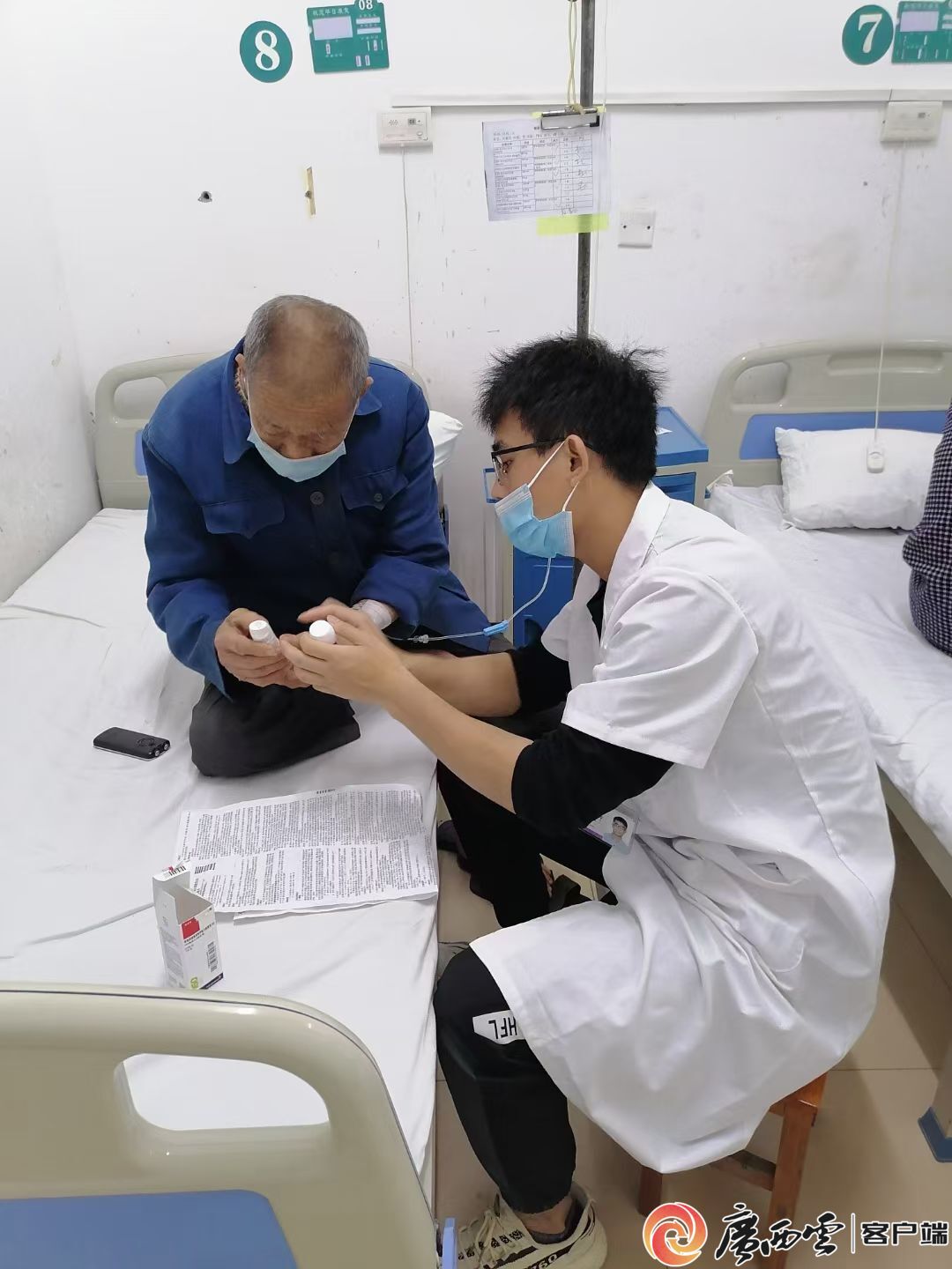 唐家伟在病床边耐心指导慢阻肺患者使用呼吸吸入装置。受访者供图 2022年4月24日晚,官成镇新平村58岁的龙女士遭遇了一场生死考验。有着多年高血压病史的她,突然出现剧烈的胸口压榨性疼痛,大汗淋漓、呼吸困难,家人惊慌失措地拨通了唐家伟的电话。“很可能是急性冠脉综合征,时间就是生命!我们马上出发!”电话那头,唐家伟听完症状描述,语气沉稳而果断。 随即,他迅速组织医护人员,救护车的声声鸣笛,划破乡村宁静的夜空。到达患者家中后,护士迅速接上心电图仪器——屏幕上清晰的波形显示:急性下壁心肌梗死。血压偏低,病情危重。 “快,让患者服药!”唐家伟立即让龙女士服下阿司匹林、氯吡格雷等急救药物。同时,转运的担架已经备好,医护人员小心翼翼地将她抬上救护车,直奔平南县人民医院胸痛中心。车上,监护仪滴滴作响,蓝光闪烁,每一秒都在与死神赛跑。 前方,介入手术室灯火通明,只待患者一到,便能立刻开通堵塞的血管。这场争分夺秒的生命接力,因他的精准判断和快速反应,为龙女士赢得了最宝贵的生机。 急诊救治、门诊诊疗、院后随访……作为基层群众的“健康守门人”,唐家伟深知基层群众对优质医疗服务的期盼。对一些家庭困难的患者,他主动承担起随访的工作。 在官成镇八宝村东兴屯,78岁的老人林阿婆谈起唐家伟满是感激:“唐医生很好,我能站起来全靠他。”原来,2022年9月,林阿婆突患大面积脑梗死。在平南县人民医院度过危急期后,出院后的她从此长期卧床,生活全靠家人照料。 由于家庭经济较困难,无法承担康复机构的服务费用,家属只能在家中摸索着护理。唐家伟得知情况后,二话不说,主动承担起每月定期上门随访的任务。无论刮风下雨,他都会如约来到老人床前,小心翼翼地更换胃管,仔细检查有无感染、压疮,还一遍遍手把手教家属翻身、拍背、做肢体被动活动。