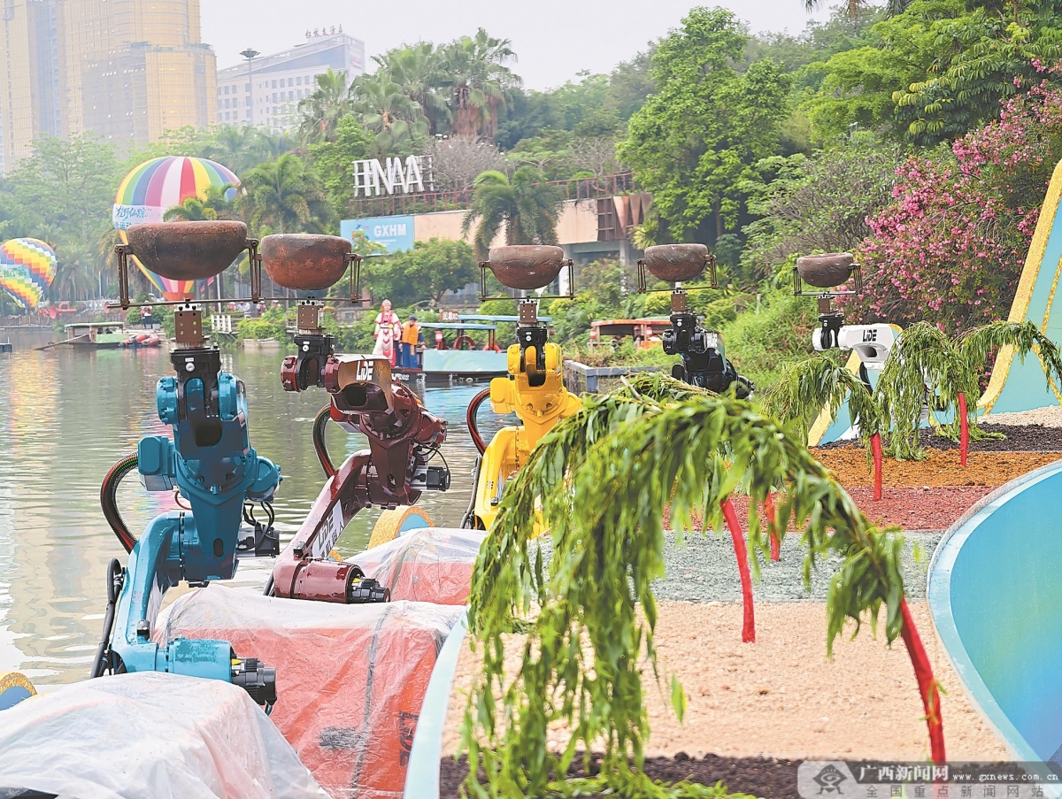 智能机器人身着壮锦特色服饰,与观众一同欢跳竹竿舞。 智能机械臂与市民游客共赴春日祈福之约,让传统习俗充满科技新鲜感。在“五土润柳·铸同心”环节,别具匠心的插柳祈福仪式惊艳全场。五个智能机械臂稳稳托举着大陶碗,碗中盛放着青、红、白、黑、黄五色沙土,随着现场指令下达,机械臂精准地将彩沙倾洒在指定区域。
