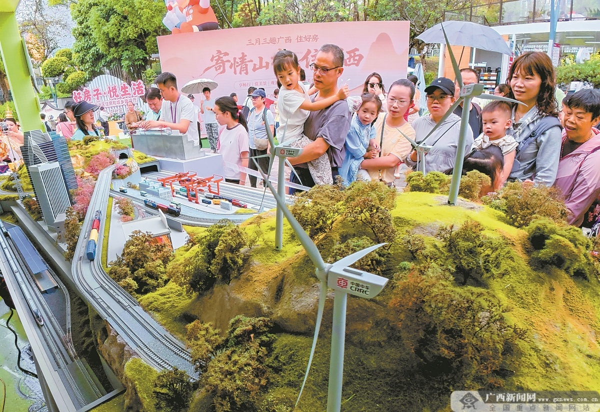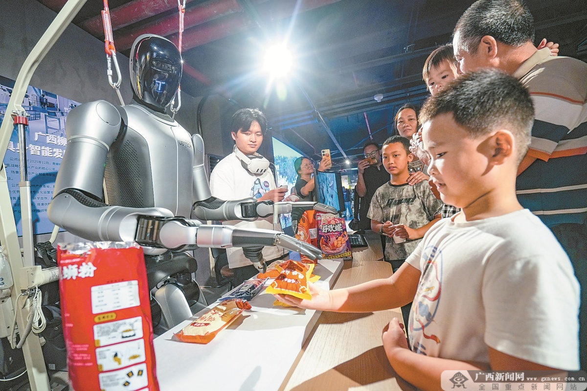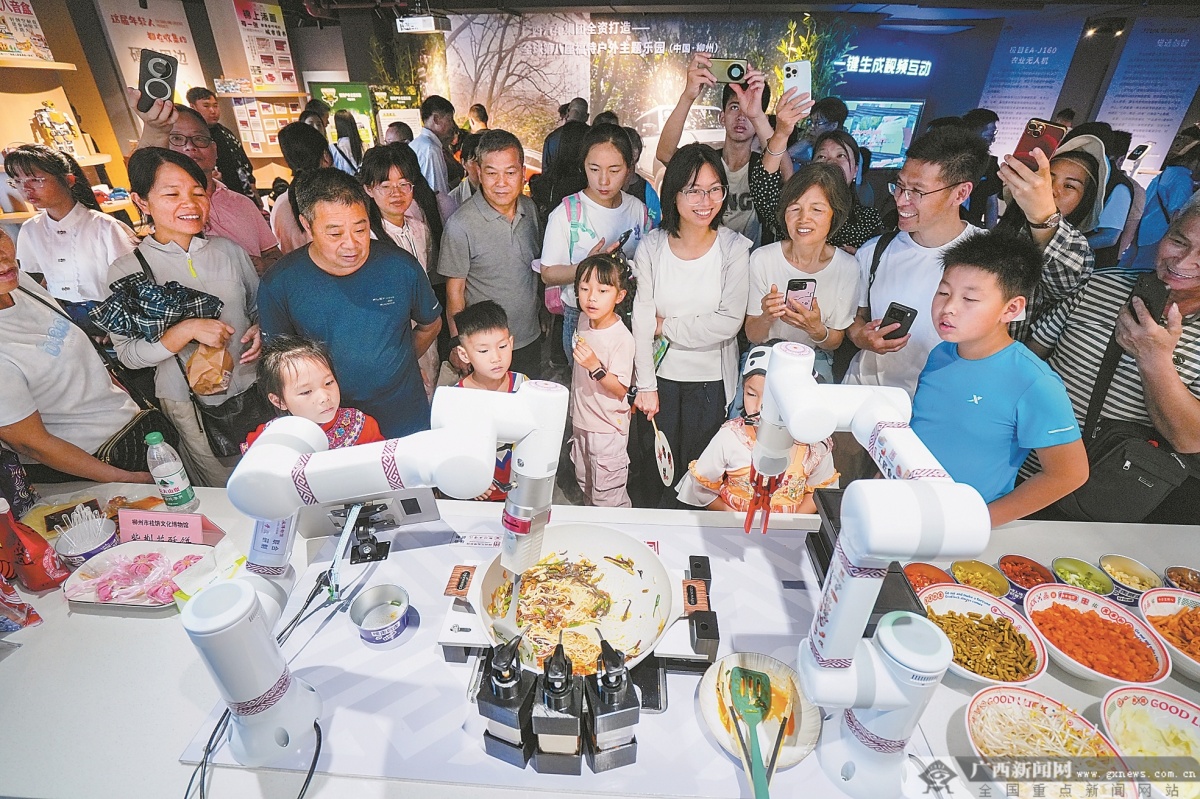 观众驻足观看广西产业发展模型。 除了祈福仪式上的亮眼表现,各类智能机器人在“智启未来·AI岛”展区大显身手。机器人现场制作冰淇淋、快炒螺蛳粉,游客与机器人共跳竹竿舞、对弈下棋,还有机器人开展普法、养生科普……有趣的互动体验,让前来游玩的市民游客大开眼界。