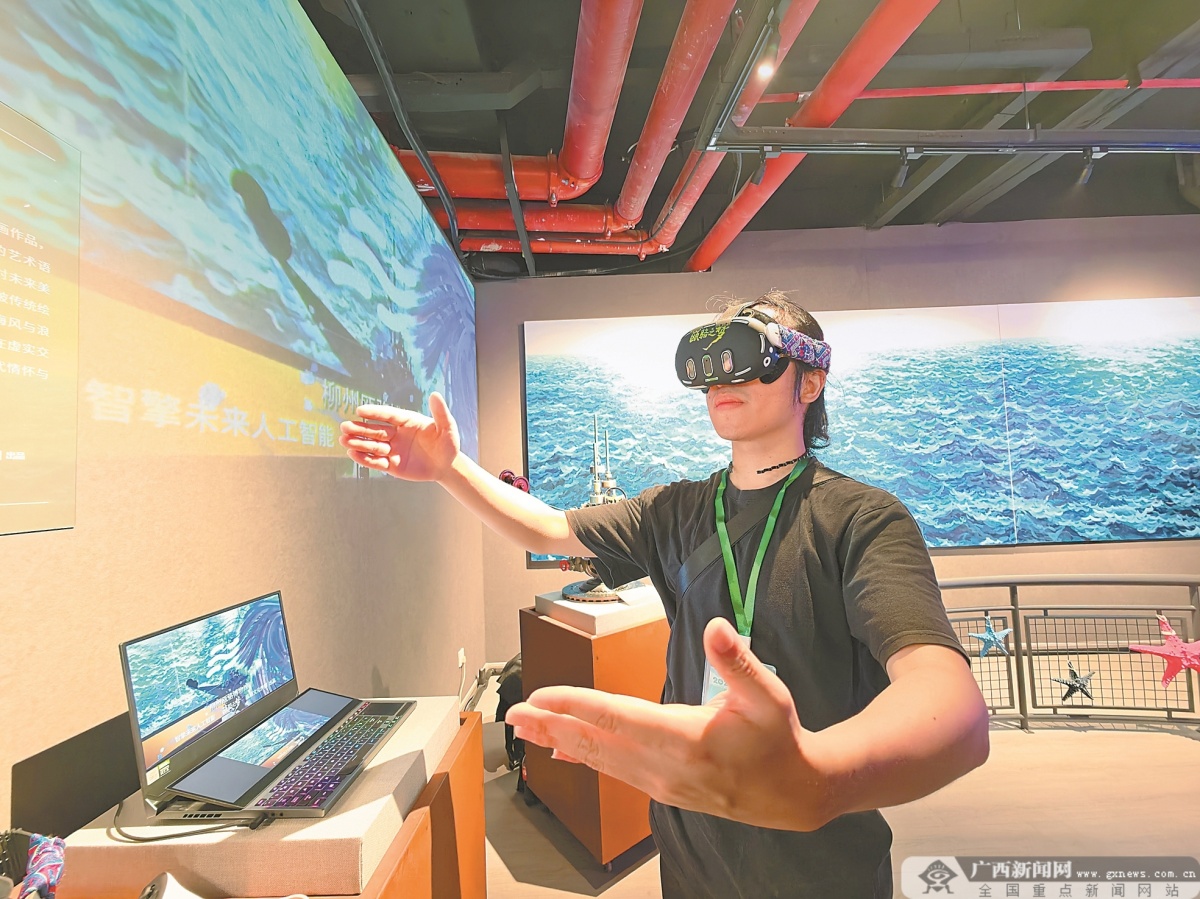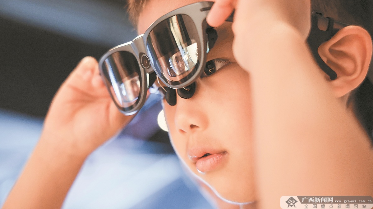 一名小朋友在体验智能眼镜。 不止于民俗互动体验,AI技术更深度融入文化创作与文博讲解领域,为八桂文化传播打开全新视角。在AI+出版+微短剧馆内,原创AI短剧《郑和再度出发,新时代的文化出海》吸引众多游客驻足观看。 在柳州人工智能工业国潮馆,AI技术也为文旅体验添智赋能。不少游客佩戴上AI讲解智能眼镜,近距离欣赏文物时,眼镜摄像头能自动识别文物,娓娓道来历史文物背后的故事。目前,这款AI讲解智能眼镜已在柳州工业博物馆上线。