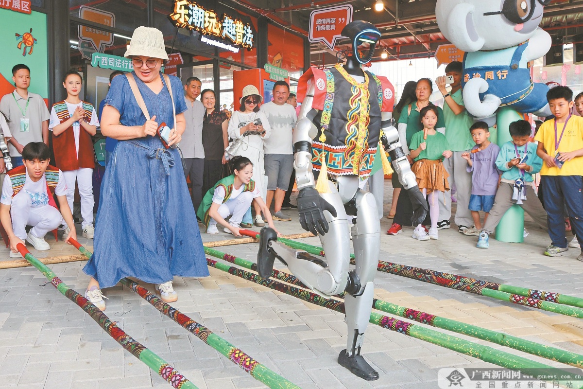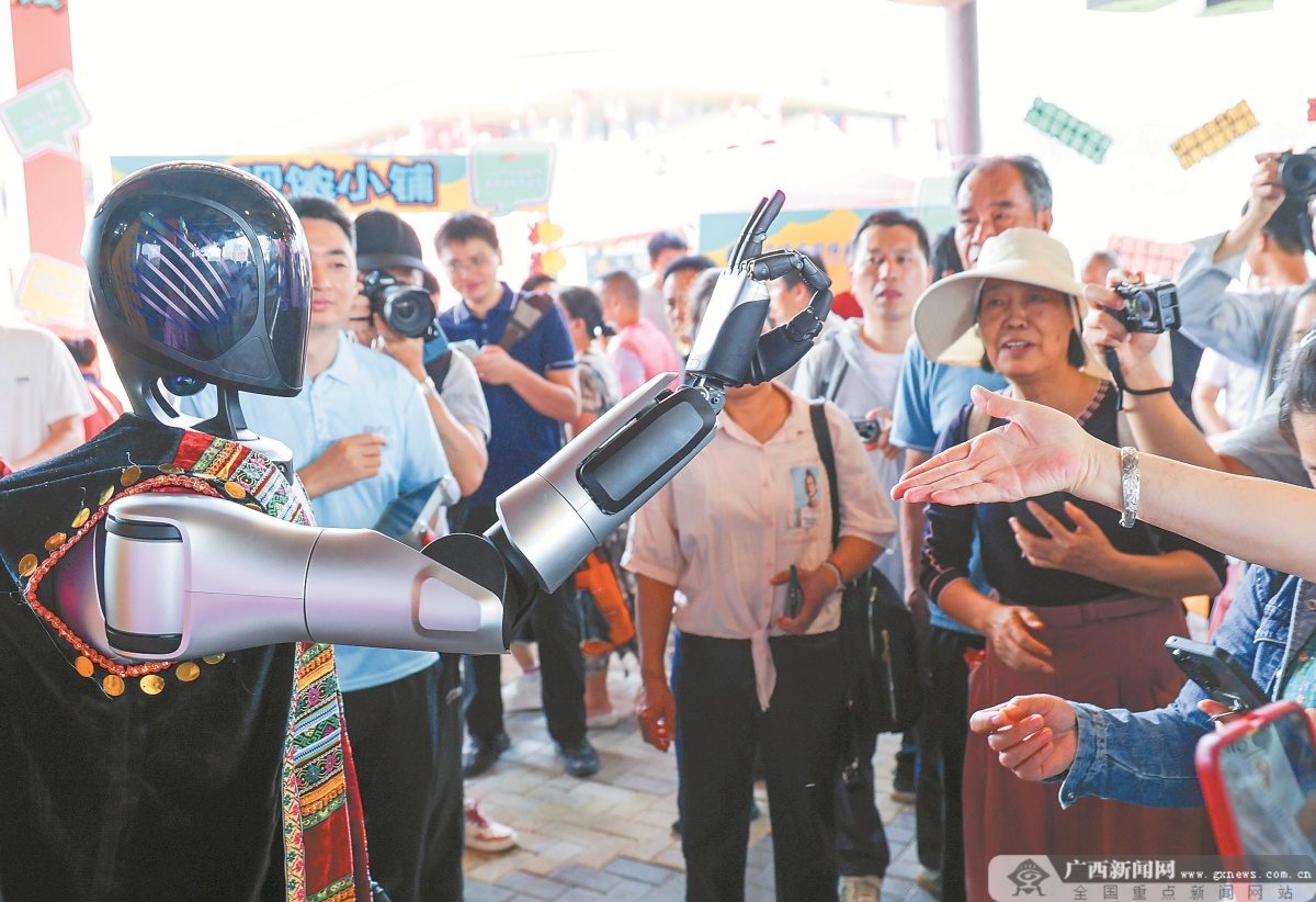 机器人与观众热情互动。 漫步智启未来·AI岛,科技民俗盛宴精彩纷呈。当八桂民俗风情与新时代人工智能相遇相知,不仅为大众带来了耳目一新的沉浸式游玩体验,更让优秀传统文化在数字时代找到了全新的表达载体,焕发蓬勃新生机。