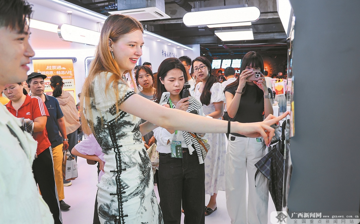 一名外国友人在体验AI拍照,定格幸福时刻。 在民俗互动展位前,人头攒动。游客只需戴上AI眼镜,操作遥控手柄,就能轻松操控机器人,参与投绣球、插花、叠壮锦等极具广西特色的趣味活动,在沉浸式互动中深入了解广西民俗文化。