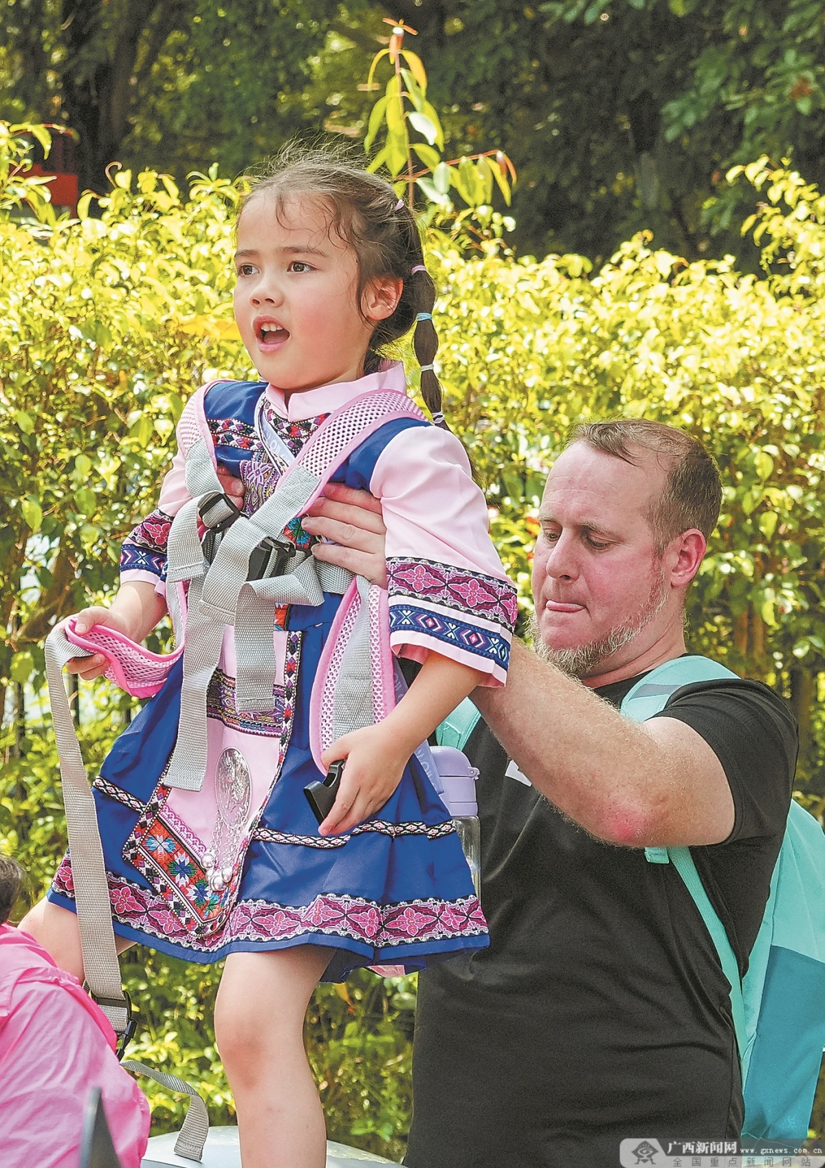 一名身穿壮族服饰的外国小女孩在爸爸帮助下观看表演。 对于这场跨国音乐盛宴,“广西三月三·八桂嘉年华”导演组表示,此次集结巴西乐团、东盟艺术团体与广西民族歌队同台献艺,既是中外文化的交融碰撞,也以艺术形式生动诠释了构建人类命运共同体的深刻理念。 “这是我第一次参加广西三月三的活动,现场浓郁的民族风情和动听的歌声让我深深着迷。”来自越南的游客阮陈青山兴奋地说,“我拍了很多照片和视频,要和家人朋友分享这份来自广西的热闹与美好。”