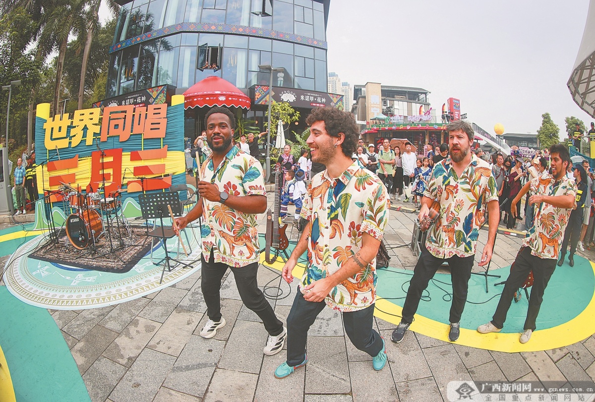 外国艺术家倾情献艺。刘峥 摄 “非常荣幸受邀参加‘广西三月三·八桂嘉年华’,感谢广西的热情款待。”巴西里约热内卢科帕卡巴纳要塞乐团团长玛西亚·梅奇奥尔激动地说,“能在这里向中国观众展示巴西音乐,我们非常开心。我本以为这里的观众会比较内敛,没想到大家全程热情参与、积极互动,这份热烈的回应让我倍感惊喜。我们深深喜爱南宁、热爱广西,我一定会向巴西的朋友们推荐这场精彩的盛会,真希望能在这里多停留几天。”