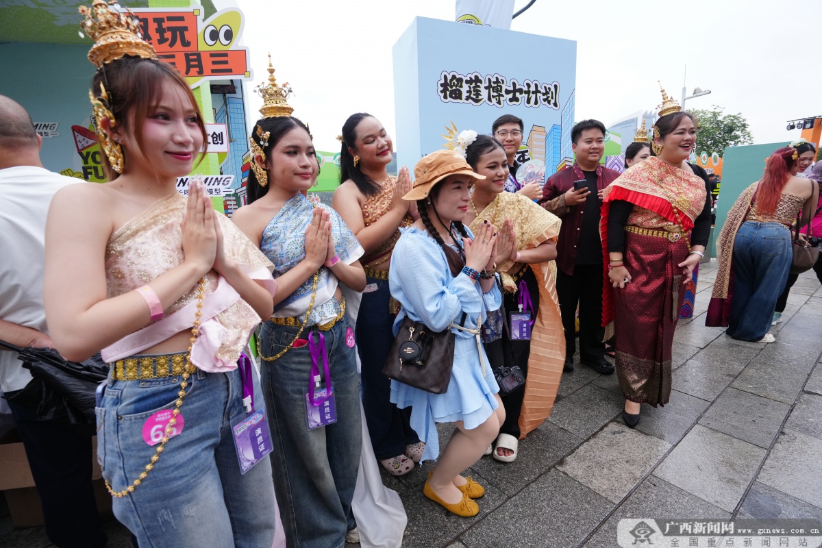 泰国演员与观众热情互动。 当巴西里约热内卢科帕卡巴纳要塞乐团奏响热情奔放的《雀鸟》,“世界同唱·三月三”单元的现场即刻沸腾。这支青年乐团用充满活力的演奏征服了在场观众。多元音律接踵而至,越南歌手演绎热门旋律《叮叮当当》,马来西亚乐队带来童趣盎然的歌谣《IKAN KEKEK(小马鱼)》。在广西本土歌手的领唱下,身着绚丽传统服饰的东盟青年及其他各国表演者共同唱响广西经典民歌《山歌好比春江水》。精心创编的音乐串烧行云流水,时而激昂热烈,时而婉转悠扬,每一段旋律都诉说着不同国度、不同民族的文化故事,每一个音符都传递着“各美其美,美美与共”的愿景。