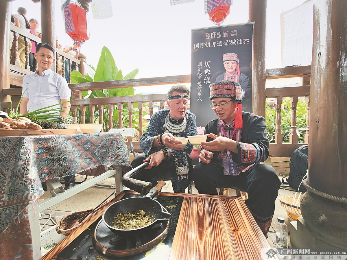 国家级非遗恭城油茶代表性传承人周黎维与他的美国徒弟唐果果一同打油茶。