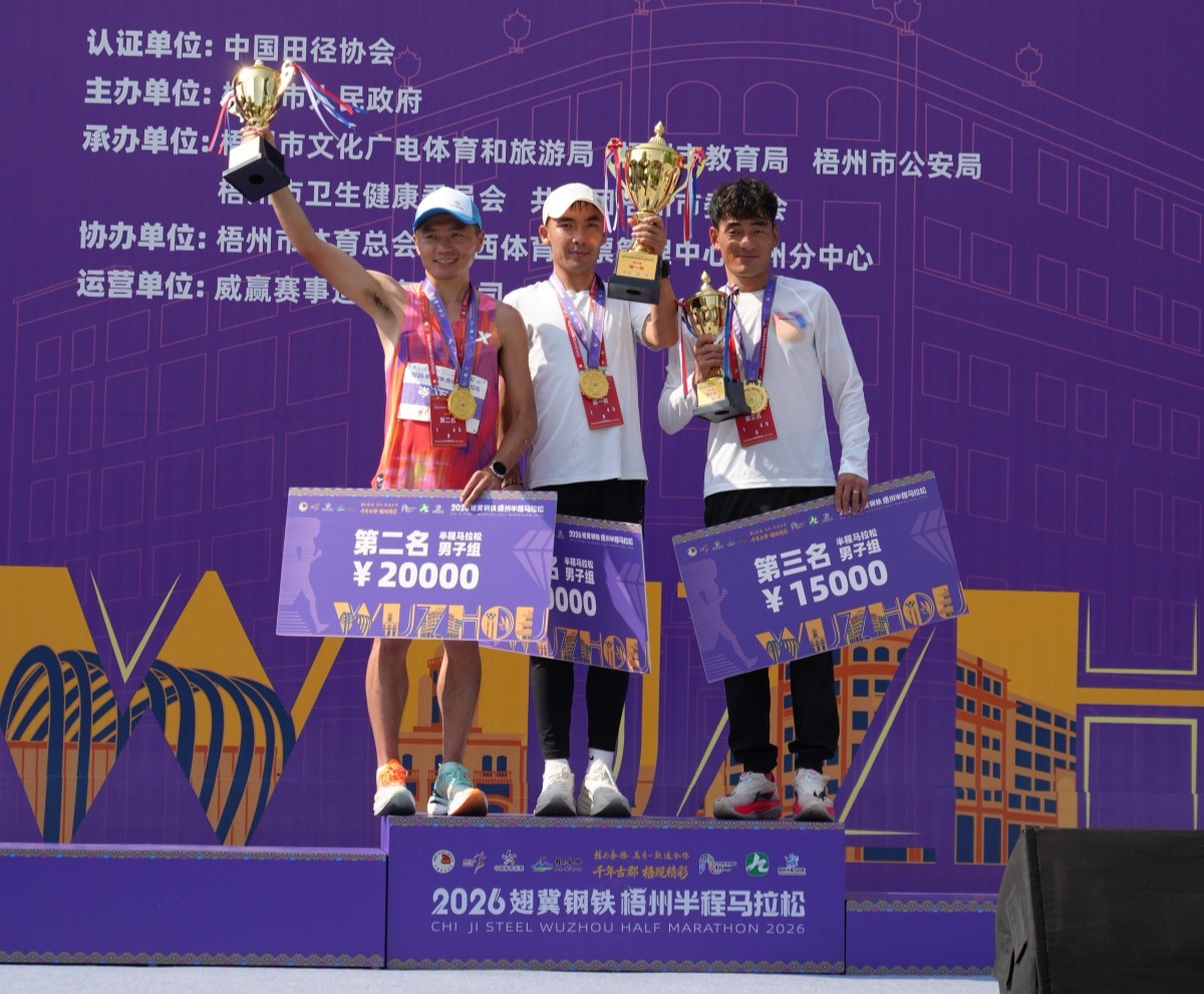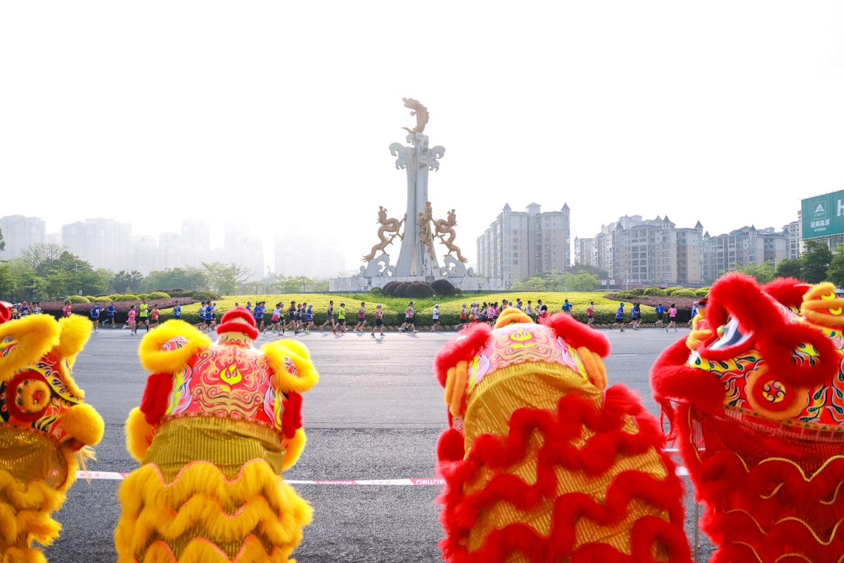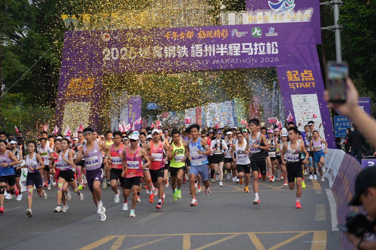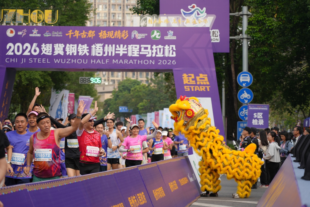 4月19日上午7时30分,2026翅冀钢铁梧州半程马拉松在梧州市图书馆鸣枪开跑。1.2万名跑友迎着春日晨光出发,用脚步感受梧州的千年文脉与三江秀色,一场融合体育竞技、岭南风情、城市狂欢的体育盛宴正式启幕。 起跑。 记者 赵超 摄 随着发令枪响,1.2万名跑者并肩冲出起点,紫、粉色的身影汇成一条流动的彩带,欢呼声、呐喊声瞬间点燃整座城市的热情。 本届赛事沿用“千年古郡梧现精彩”主题,由梧州市政府主办,梧州市文化广电体育和旅游局等单位承办,列入广西“桂马奔腾 总有一款适合你”系列赛事、《跟着赛事去旅行|2026年二季度广西体育赛事目录》、2026年广西三月三文旅体商农联动促消费活动。 醒狮助威。记者 赵超 摄
