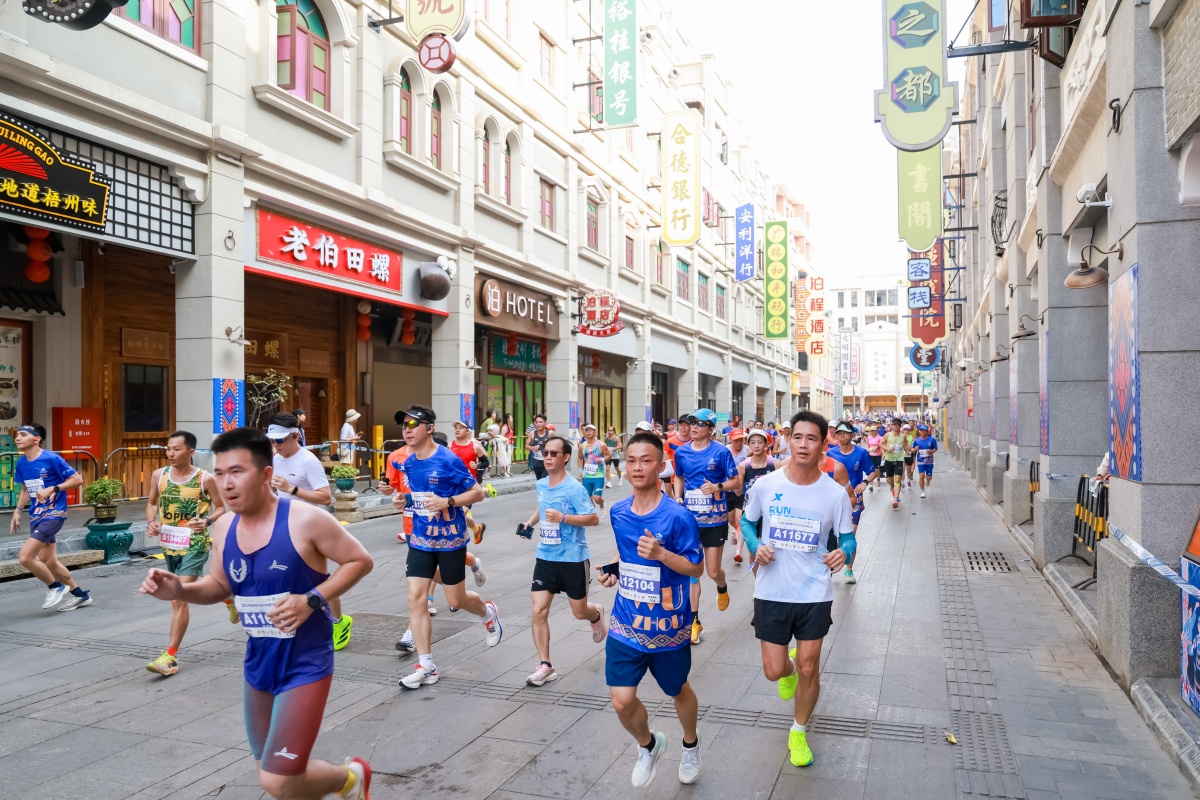 跑过骑楼城。赛事主办方供图 赛道之上,步步皆景、处处欢腾。优化升级的赛道以梧州市图书馆为起点,串联玫瑰湖公园、西堤公园、骑楼城等梧州城市地标,从城市公园的生机勃勃,到骑楼街区的烟火气息,再到三江交汇的自然景观,万名跑友在奔跑中尽览西江碧波与城市新貌。赛道沿线还设置6个氛围营造展演点,将特色非遗与现代活力贯穿全程:三龙大道转盘旁,醒狮腾跃扑闪、灵动威武,为跑友助威送福;骑楼城街巷,粤剧演员们身着精美戏服亮相,将经典粤剧身段、唱腔与岭南戏曲韵味生动呈现。此外,精彩的乐队演唱、鼓舞、彩带舞龙等演出,为选手加油鼓劲。