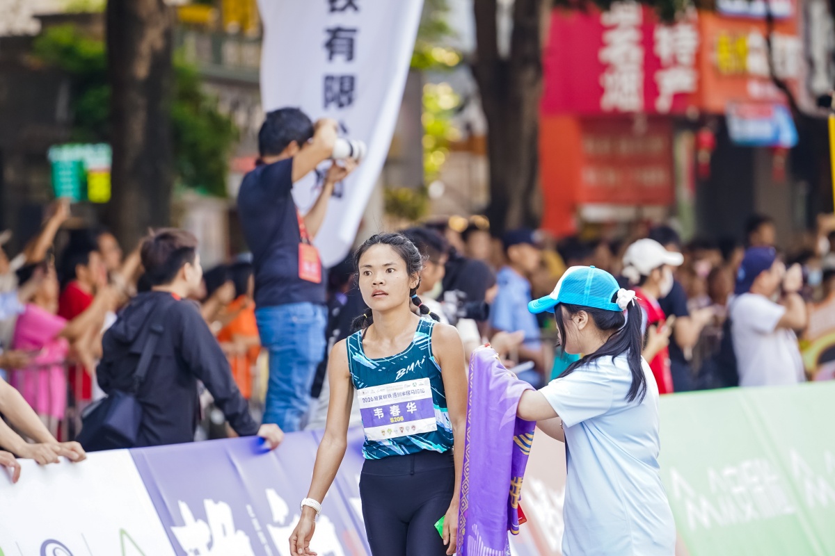 广西选手韦春华获女子组第二名。赛事主办方供图 经过激烈比拼,来自新疆的叶尔安·叶列吾斯孜和来自浙江的唐晓芳以1:07:33和1:14:01的成绩分别获得男子组、女子组冠军。