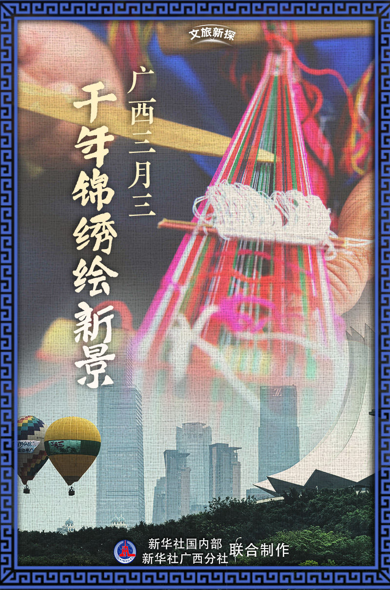 2026年“广西三月三・八桂嘉年华”活动开幕式现场随处可见壮锦元素。新华社记者 王楚然 摄 壮锦位列“中国四大名锦”,技艺根脉可远溯至汉代。考古工作者在广西罗泊湾汉墓七号残葬坑中,发掘出数片橘红色回纹锦残片,实证了这项织锦技艺已在南疆大地上绵延两千余载。 千年技艺薪火相传,离不开一代代匠人的执着坚守。 在广西靖西,靖西市壮锦厂厂长、国家级非物质文化遗产壮族织锦技艺代表性传承人李村灵端坐于老式织锦机前,默默耕耘着这份古老技艺。1987年,年仅20岁的李村灵踏入靖西壮锦厂,自此便与斑斓万千、纹样各异的壮锦结下了半生不解之缘。 为吃透这门手艺,她沉心潜学,从纺纱、染线,到梳纱、穿综、挑花,再到上机织造,一道道繁复工序逐一攻克。在日复一日的引梭穿线间,她心中熟记万千图案,终练就“图在心中、随手成纹”的精湛技艺。 细细端详壮锦,纹样繁复精巧,各有意趣,无一重复。“蛙纹是古老图腾、象征生生不息,凤纹寓意吉祥如意,每一种纹样,都藏着祖辈对生活的美好期许。”李村灵说。 千变万化的纹样肌理,或许正是壮锦跨越千年岁月、依旧能俘获当代年轻人的魅力所在。如今,科技为传统技艺赋能,深藏于壮锦之中的纹样“基因”被逐一解码,让古老锦绣焕发崭新生机。 自2013年起,广西织绣发展研究会执行会长贺定钰便带领团队,联合高校深入广西各地村寨,系统采集、整理散落民间的传统壮锦纹样,对其精细解析、提炼吉祥文化符号,逐步建立起壮锦纹样“基因库”与数字化保护平台。 “过去设计师埋头数月方能完成的复杂花本设计,如今依托数据库调取纹样、重组创新,不仅大幅缩短创作周期,还能为用户定制专属纹样。”贺定钰介绍道。 数字化平台既守护了传统纹样版权,更让壮锦图案走出面料本身,融入抱枕、瓷砖、服饰、文创等日常用品,实现传统技艺与现代生活的深度交融。“壮锦纹样真正从织机上‘走’了出来,成为鲜活可感的文化符号。”