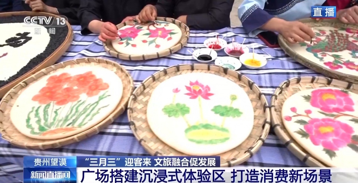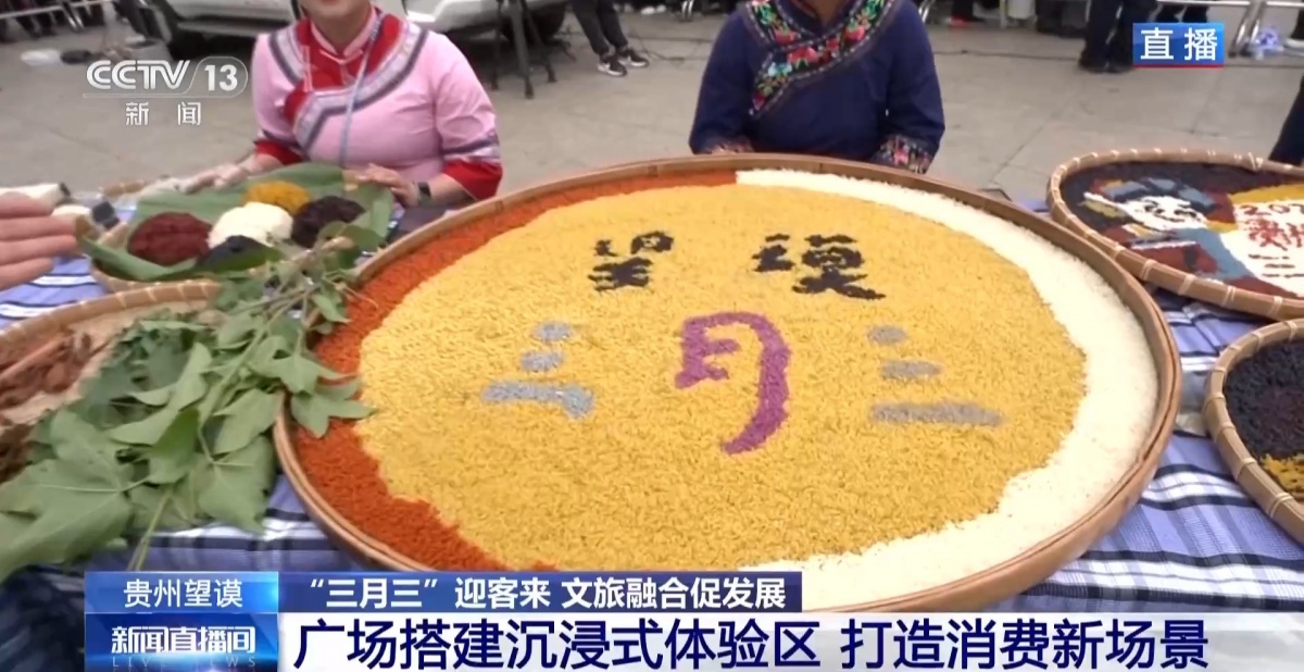除了巡游展演外,这次望谟“三月三”活动中,在广场搭建了互动体验区,打造消费新场景,游客们可以分批进入现场体验。这里展示的就是望谟紫茶的炒制以及冲泡技艺;蜡染制作体验区,从织布到画蜡再到浸染,全流程展现指尖上的蓝白美学。在望谟,布依族“无糯不成席”。簸箕里“望谟三月三”欢迎您的字样就是用五颜六色的糯米饭拼成的。用春天鲜嫩的枫香叶、绽放的密蒙花等植物染出艳丽的色彩,每一口都带着春天的味道。