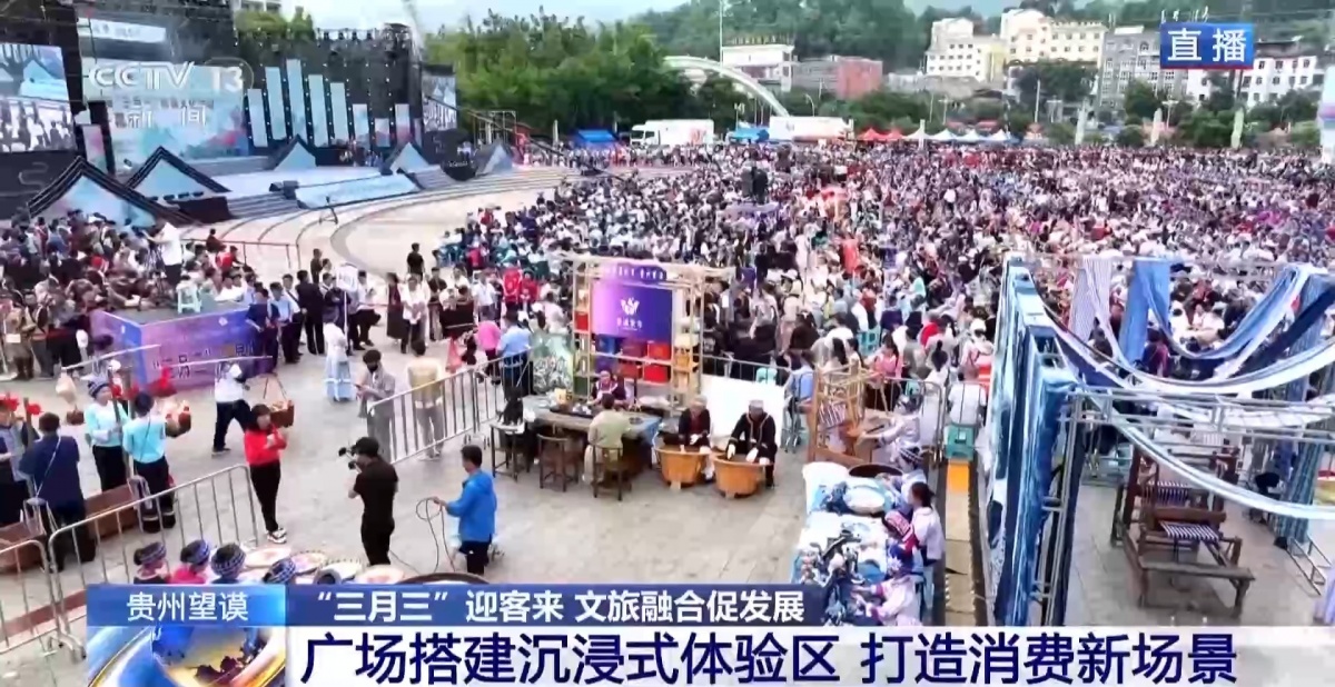 广西素有“歌海”之称,南宁被称为“天下民歌眷恋的地方”,正在表演的《山水派对》改编自广西经典民歌《多谢了》,以民歌新唱的方式,拉开“三月三”歌圩的序幕。青春唱跳组合与广西以及外国歌手同台欢聚,以歌为媒、以舞为伴,唱的是山水的派对,更是青春的派对。也用旋律搭建跨国的友谊之桥。生动展现南宁的时尚活力、开放包容。 在“广西三月三”假期期间,不仅仅在南宁,在广西各地,各个民族的同胞们都开展着丰富多样的活动欢庆“三月三”的到来。 “三月三”迎客来 文旅融合促发展 贵州省望谟县是布依族同胞聚集生活的地方。当地布依族文化保存完整,布依族“三月三”是望谟非常重要的传统民俗节日,被列入国家级非物质文化遗产代表性名录。每到农历三月初三,生活在这片土地上的人们会身穿节日盛装,载歌载舞祈求风调雨顺,感恩自然馈赠,迎接春天的到来。今天在望谟有哪些特色活动呢? 记者 陈春晓:今天早上八点已经有游客在广场上占位置了。此时此刻,广场上观众区已经站满了人。 49支巡游方队 街道变身“村舞”大舞台