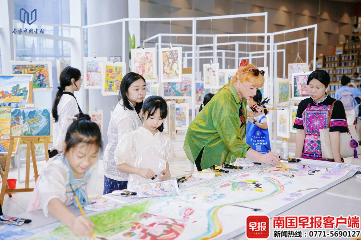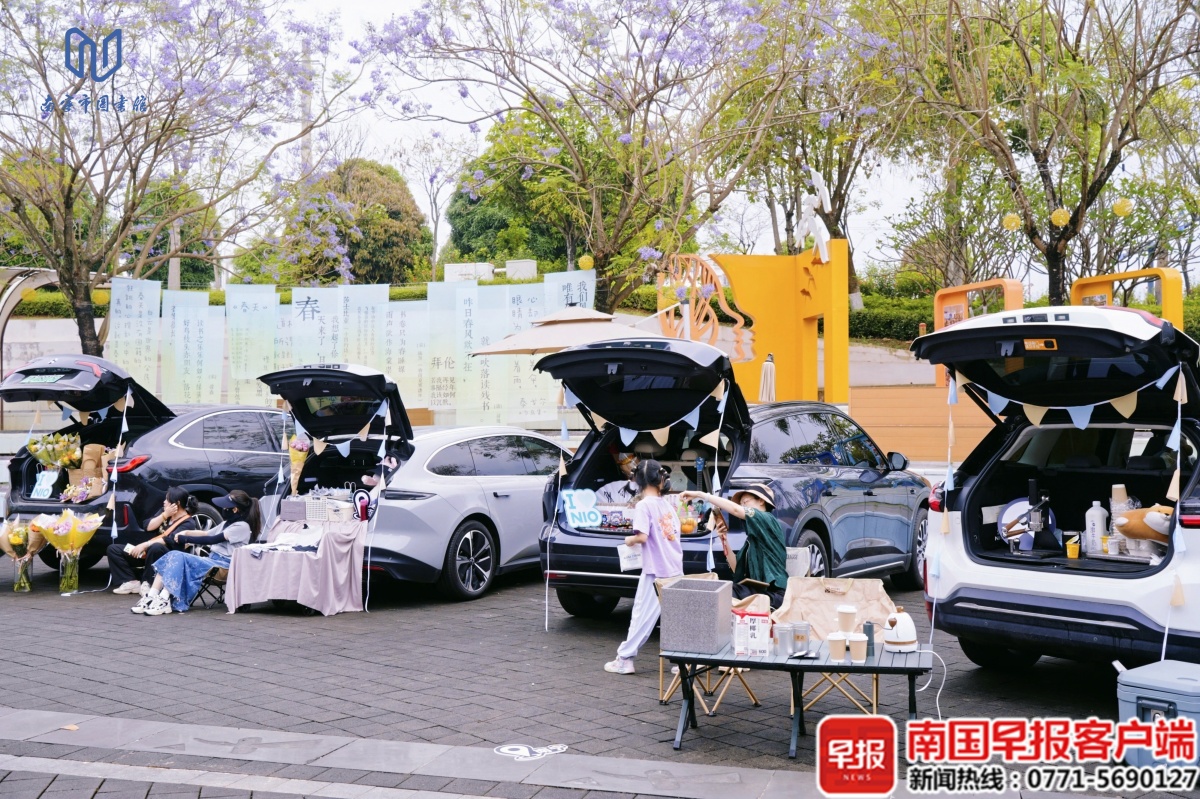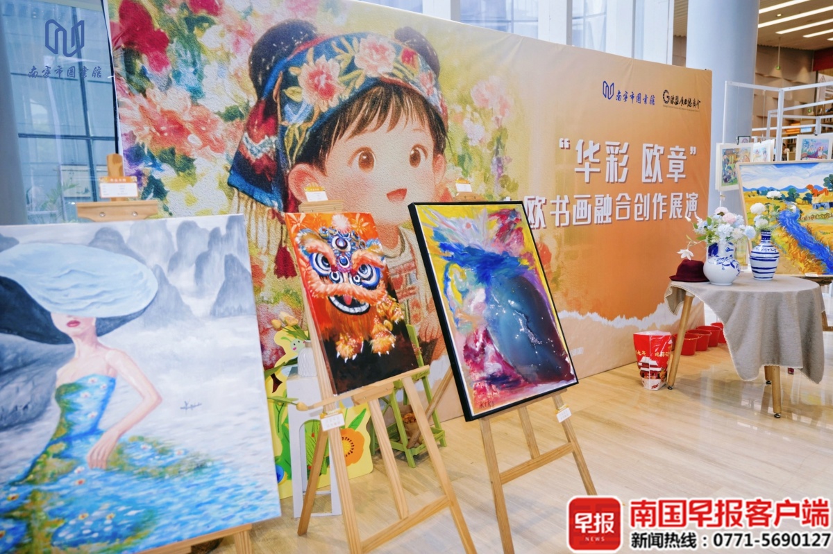 4月18日,恰逢广西三月三,2026年南宁市公共图书馆服务宣传周、全民阅读活动周暨4·23世界读书日主题活动在南宁市图书馆启幕。活动以“书香南宁 阅享绿城”为主题,将公共图书馆服务推广、全民阅读倡导与广西传统节日融合,用一场有温度、有创意、有烟火气的文化盛宴,让阅读走进日常,让书香浸润全城。 当天,丰富多彩的活动依次展开。“绿城讲坛”特邀南宁市方志馆方志文化宣讲团讲师,带来“话说南宁——南宁历史名称演变溯源”主题分享,带领听众探寻南宁的发展脉络。 作为本次活动周的一大亮点,“墨彩流光·中德艺境共绘长卷”活动吸引了众多市民。中德艺术家与少儿读者携手执笔创作,画卷以抽象色块过渡,象征中德文化的融合。同步开展的“华彩欧章”中欧书画融合创作展览以“艺脉相连·文明互鉴——我眼中的中欧文化融合”为主题,吸引了广大青少年踊跃参与,共征集到数百幅涵盖书法、水彩、油画、国画等多种形式的创意作品。 “华彩欧章”中欧书画融合创作展览。 “墨彩流光·中德艺境共绘长卷”活动。本文图片均为南宁市图书馆供图 少儿阅览区则成了孩子们的欢乐天地。“壮韵书香飘童阅三月三”童书推荐专架前,摆满了适合少年儿童阅读的壮族民俗故事绘本、科普读物。“亲子共读”环节,大家一起朗读壮族民间故事,让阅读成为最美好的亲子时光。 “智阅蔚来‘书’果文创市集”把汽车后备箱打造成“移动书屋”“爱心果园”,通过“以书换书”“以书换果”的趣味形式,推动图书循环共享,拓展阅读场景。 “书”果文创市集。 据悉,本次全民阅读活动周将持续至4月25日,其间还将开展2026粤港澳桂琼“共读半小时”活动、国家图书馆第二十一届文津图书评选推广、“书香传递积分有礼”读者积分兑换等一系列活动 |
