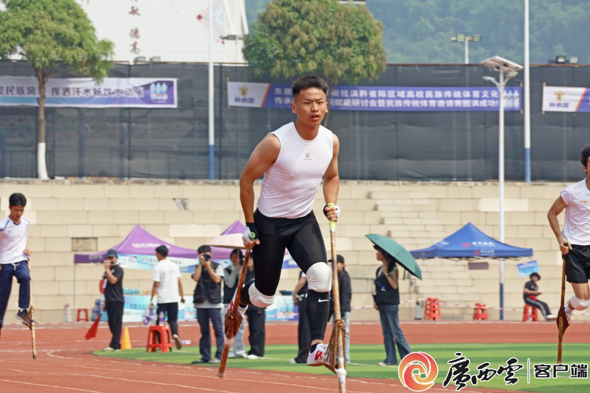 运动健儿展示高脚竞速。覃品悦 摄 在4月15日的桂滇黔省际区域民族传统体育文化传承创新与协同赋能研讨会上,12所高校的学者围绕西南地区民族传统体育文化资源的发掘、传承与弘扬发展进行了学术交流。交流中有思想的碰撞,也有学理的争鸣,更多的是学者们深化交流与合作、共同致力于少数民族体育运动在体育强国建设事业发挥作用的时代使命与历史担当。 学者们在研讨中就助力民族体育文化跨区域传承发展与文旅产业融合,把西南地区富集的传统民族体育文化资源出圈转化为文旅产业提质增资、推动乡村振兴高质量发展的新增长极深入交换了意见,共同探索三省区民族体育资源整合、文化协同发展的新路径。 活动期间,百色学院师生们展示了该校民族传统体育教学成果,集中展现了百色校地协同将地方非遗资源转化为育人特色的实践成果。