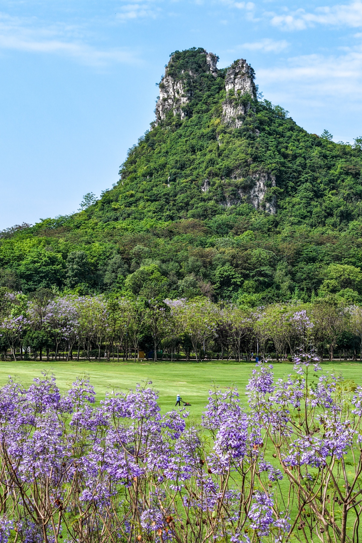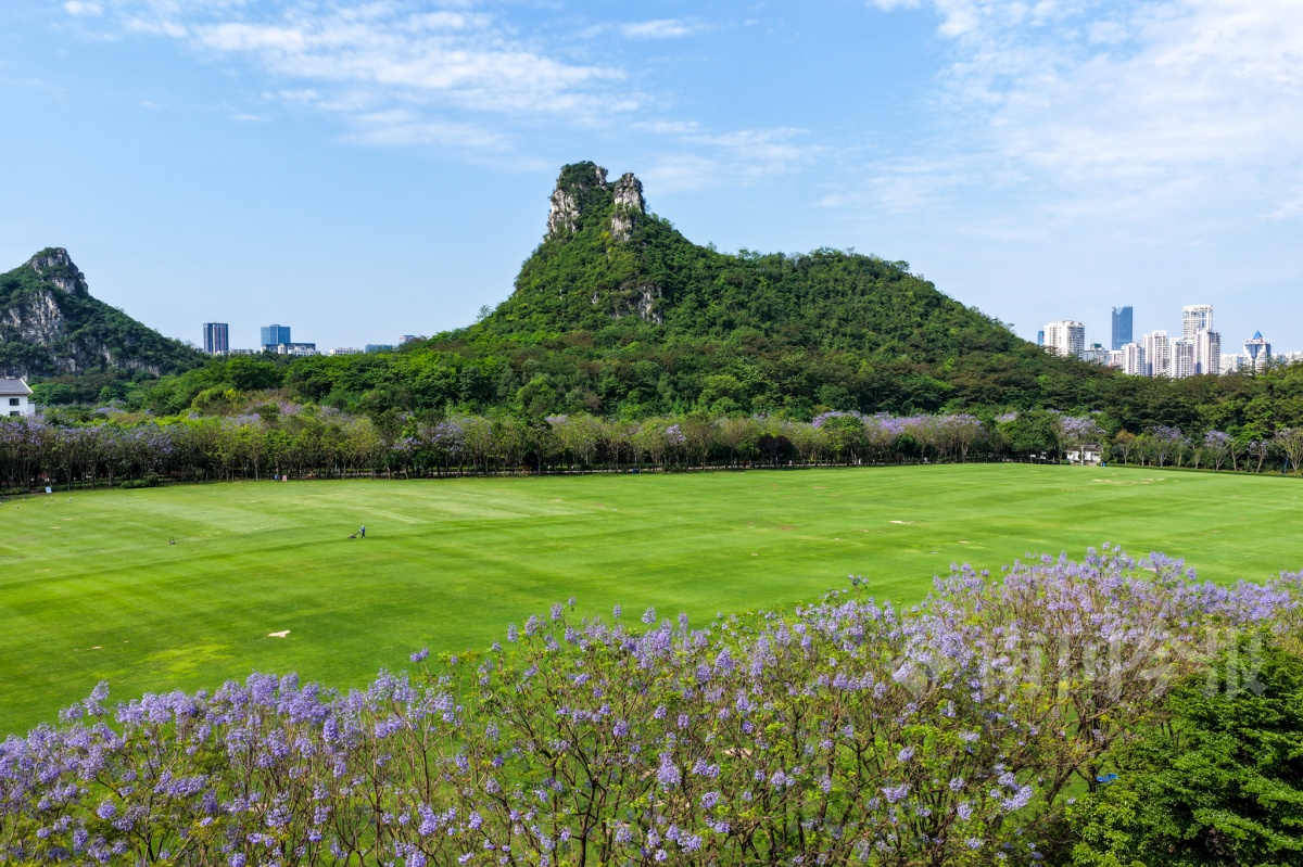 当天,记者来到马鹿山东草坪,看到整片大草坪经精细化养护后绿意盎然,宛如一块巨大的翡翠地毯。草坪中央,一名工作人员正在进行养护作业。环绕东草坪栽植的蓝花楹正值盛花期,浪漫的蓝紫色花朵与绿油油的大草坪相映成趣,恍若童话秘境。