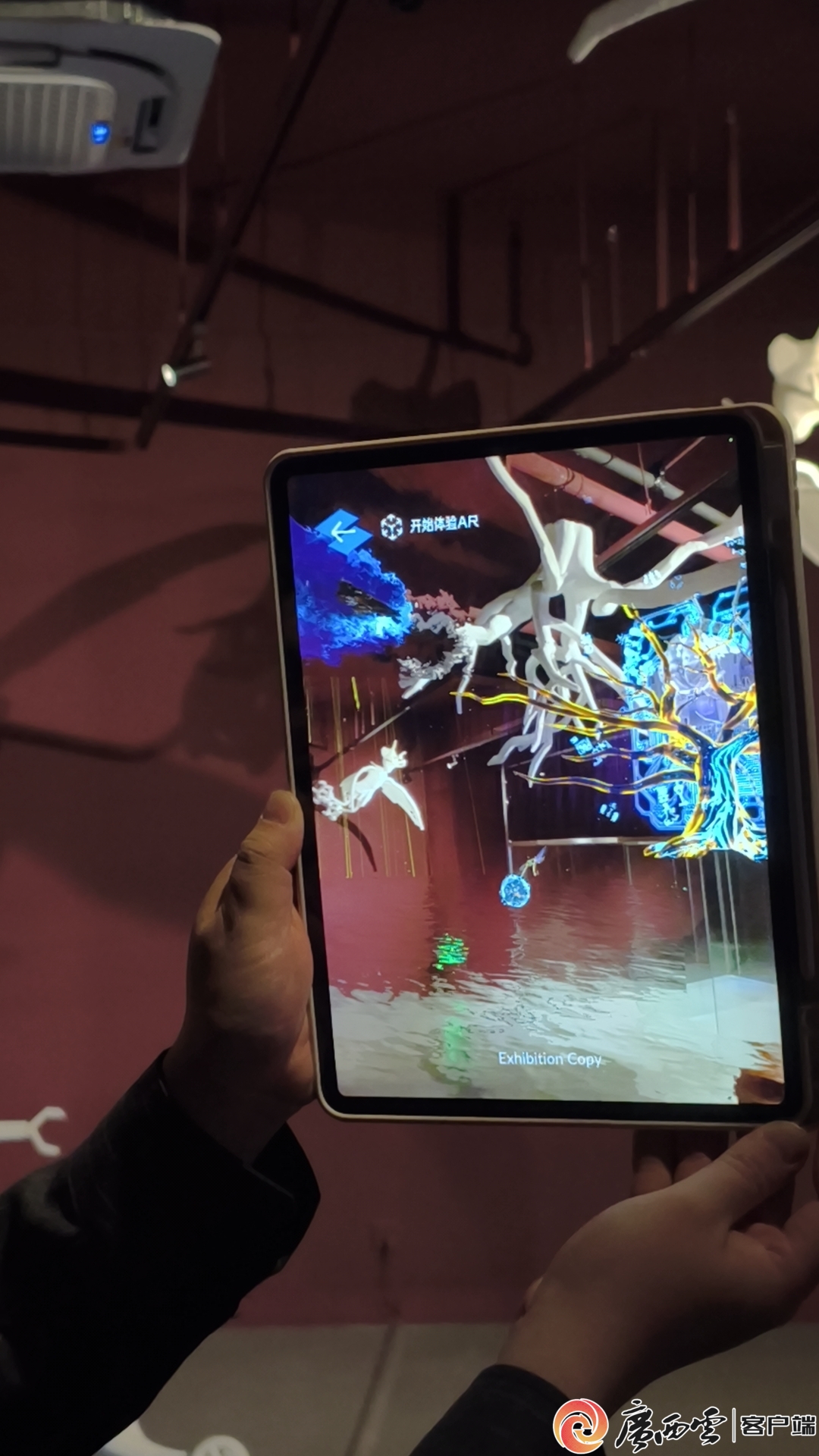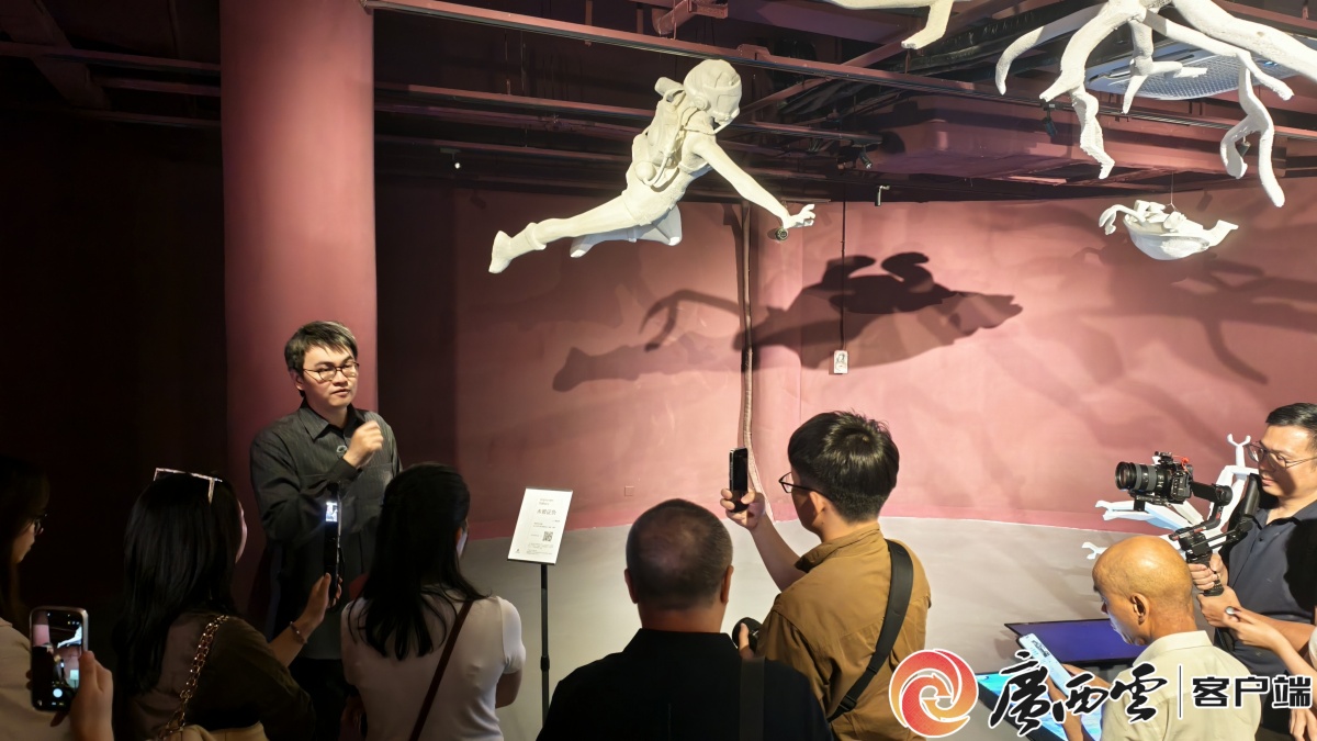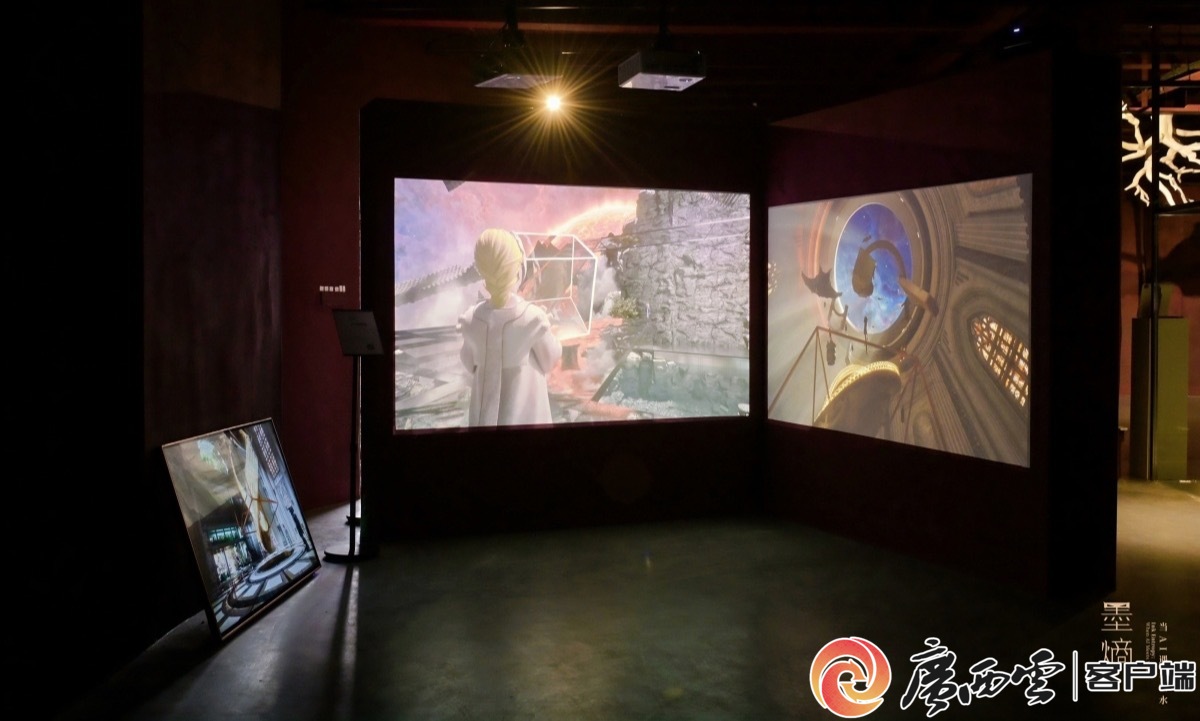午后,南宁市青秀区民歌湖国际音乐小镇的本色空间里,出品人许晓英收藏的一幅幅水墨画前,吸引不少市民驻足欣赏。“收藏没有秘诀。”许晓英在她的收藏语中对观众“说”:“好的画,能让你站住。” 4月24日,一场让许多观众“站住”的展览——“墨熵:当AI遇见山水”开幕。传统水墨与人工智能在此相遇。 策展人朱小钧介绍,展览取名“墨熵”,寓意深刻,“墨,承载东方美学的纸间痕迹,是千年来艺术家手摹心追的印记;熵,源于热力学第二定律,度量系统的混沌与秩序。” 空间内,这种“痕迹”与“混沌”正在发生奇妙的化学反应。二楼,是艺术家陈抱阳的新媒体装置。《未被证伪》以3D打印与现场影像重构视觉边界;《神动迷踪》运用投影与光影制造迷离的时空交错;《翩翩》由机械臂牵引轻纱,如舞如诉;《仿生人会梦见电子奶牛吗》则通过玻璃迷宫与VR设备搭建虚实莫辨的观看场域。陈抱阳的创作并非对传统的解构或取代,而是以数字语言转译山水意境,在确定性与混沌之间寻找新的秩序。 三楼是收藏单元,本色空间精选了20件水墨作品。党震的山水高士于萧疏散淡中见孤悬之气;祝铮鸣的《百年孤独》系列以绢本设色传递静谧而深沉的寂寥感;黄丹的《青春纪》系列在清雅设色中捕捉成长瞬间;曾健勇的少年肖像则在纸本设色中呈现出克制的叙事张力。
