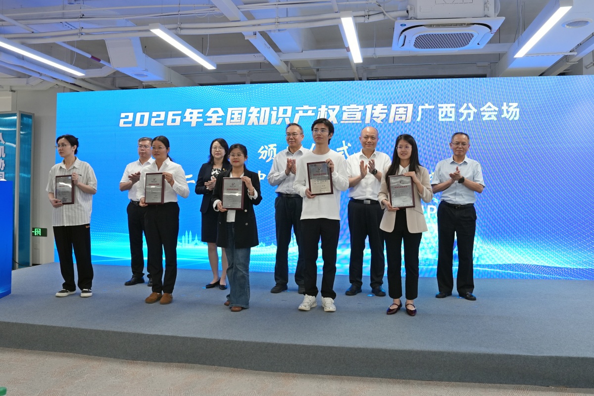 活动启动。广西云-广西日报记者 刘冬莲 摄 过去一年,广西新兴领域发展势头强劲,知识产权创新成果丰硕,实现了“一率先、两首创、三提升”。率先获得战略支持,国家知识产权局专门发文创建机制支持中国—东盟国家人工智能应用合作中心建设。 首创构建“党政产学研金法市”一体化机制,推出知识产权公共服务等系统性改革;首创建成全国首个知识产权数智化协同保护机制。建成全国首个“有色金属+AI”专利池,产业支撑能力加快提升;首创知识产权科技创新成果融合发展工作站,成果转化质效持续提升;首次代表国家在世界知识产权组织举办地理标志展,开放合作能级全面提升。 中国专利优秀奖广西获奖项目代表上台领奖。广西云-广西日报记者 刘冬莲 摄 2026年知识产权服务万里行活动广西服务专家队获授旗帜。宁佐添 摄 当前,新一轮科技革命和产业变革正加速突破,知识产权作为激励创新的“催化剂”、经济发展的“加速器”,正发挥着越来越重要的作用。 自治区市场监管局(知识产权局)有关负责人表示,将以知识产权制度创新牵引人工智能基础能力、产业规模、研发水平同步提升;搭建AI赋能的中国—东盟知识产权保护平台,构建法治化、数智化保护格局;依托融合发展工作站推动建立全链条人工智能应用生态,同时深化知识产权保护“一件事”改革以提升重点产业服务效能;建强广西—东盟知识产权商学院,打造面向东盟的知识产权国际合作高地。 |