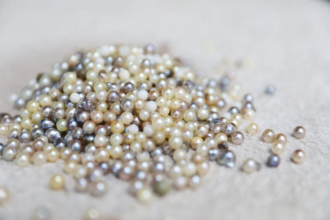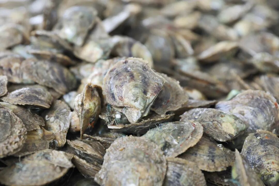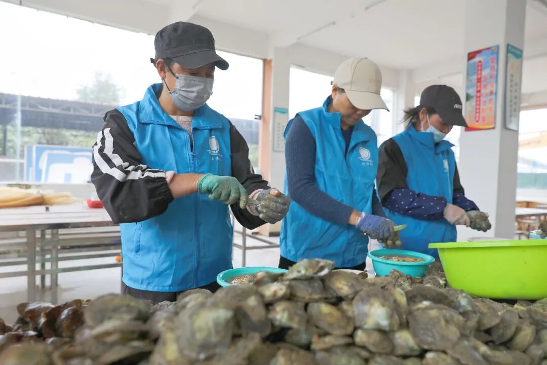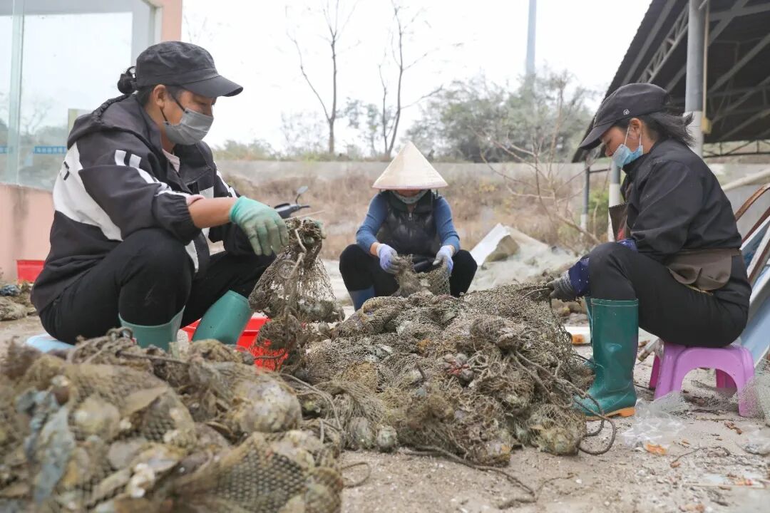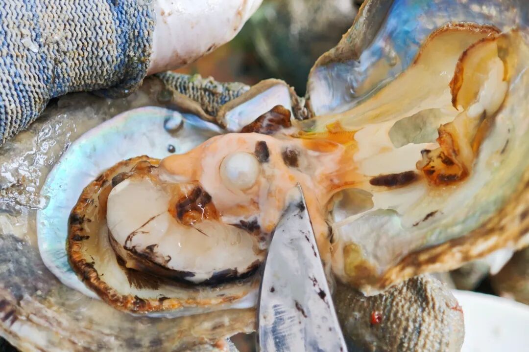 洗干净的珍珠贝。 “今天开采的这批珍珠贝是2023年投放的苗。刚下海的贝苗很小,1克就有约3000枚。投苗后要养上2到3年,才能捞起来插核,之后再养1年,才可以采珠。其间,它们还要熬过台风和西南浪的冲击。”宁定洋说。 上午11时许,工人们终于将所有珍珠贝都清洗完毕,坐到工作台前集中采珠。南珠传统养殖技艺第四代非遗代表性传承人、北海市旺海海洋科技有限公司副总经理梁菊萍一边检查珍珠贝的清洗情况,一边叮嘱工人在开贝时要注意刀法,确保贝肉完整。