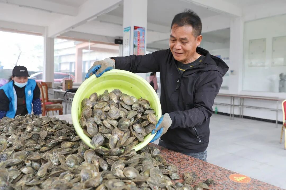 宁定洋将洗干净的珍珠贝摞到工作台上。 宁定洋告诉记者,以往,贝肉大多以食材的身份进入市场,被端上百姓的餐桌。近两年来,不少医药企业、科研院所、高校开始向公司订购贝肉和采珠时珍珠贝分泌的黏液,用于制作医药产品或开展科学研究,这也对开珠过程中的贝肉和黏液质量提出更高要求:贝肉要保持完整,黏液中也不能携带太多泥沙。 看着手里一枚枚掌心大的珍珠贝,宁定洋颇为感慨。几年前,他带着这批贝苗,趁着退潮时撑着排筏来到距离岸边约2公里的海域,将一袋袋贝苗绑到桩上。之后,宁定洋几乎每天都要到这片海域巡护,一待就是几个小时。随着贝苗逐渐长大,宁定洋每隔20天至30天就要给这些贝苗换网兜分装,前后要更换分装七八次,才能完成整个过程。