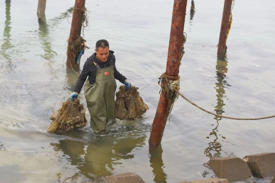 工人将装着珍珠贝的网兜拉上海堤。 “昨天下午趁着退潮,我赶紧把几十网兜珍珠贝捞上岸,这几天回暖,晚上要把网兜绑在岸边木架上,让珍珠贝在水里泡着,第二天一早再把它们捞上岸,带回工场采珠。”宁定洋说。