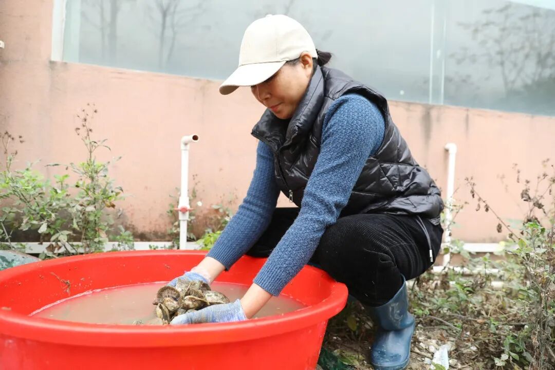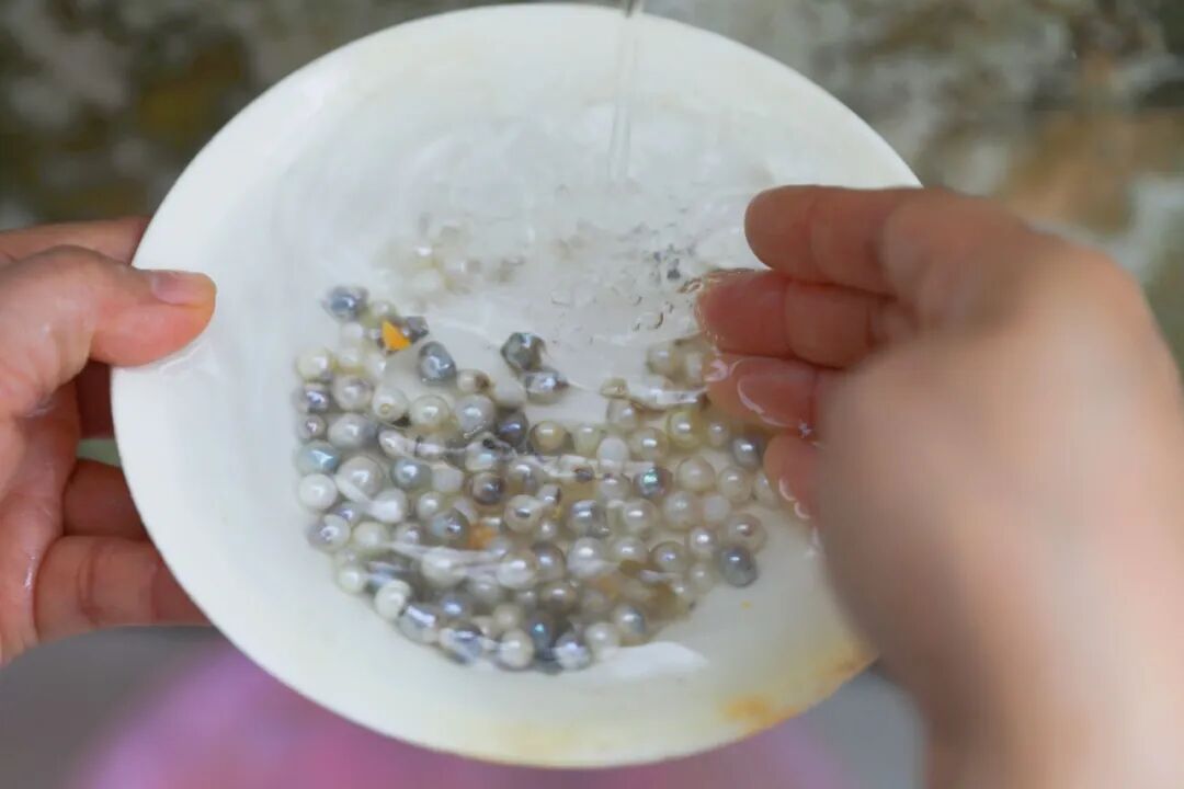 宁定洋将装着珍珠贝的网兜从水里提上岸。 回到工场,工人们将网兜解开,把珍珠贝倒到大盆里,剔除只剩空壳的死贝。宁定洋搬来一个大盆子,把珍珠贝装进盆里,洗掉附着在外壳上的泥沙、藤壶等杂质,再将清洗干净的珍珠贝摞到工作台上。