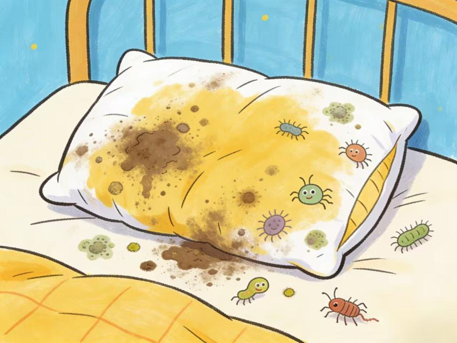 图为AI生成 比起方便易拆卸洗的枕套,枕芯的污垢往往需要更多的努力才能彻底清除,而且很多朋友不知道,很多材质的枕芯是可以洗的,结果当然就是枕着越来越脏的枕头入睡了。 不清洁的枕芯上面有什么? 枕头是我们每晚都会接触的物品,头发、皮肤上的灰尘、皮屑以及油脂都会沾染在上面。 复旦大学附属中山医院检验科主任技师郭玮介绍,使用超过1年的枕芯,其重量约有1/10可能来自汗液、皮脂、皮屑等代谢物与灰尘的混合物,这无疑成为了微生物滋生的温床。具体来看: 尘螨大军 尘螨是枕芯里最常见的,它们以人的皮屑为食,喜欢温暖潮湿的环境。人的头皮和面部每天都会脱落皮屑,恰好为尘螨滋生创造了条件。 真菌和细菌 英国曼彻斯特大学研究提醒,使用超过1.5年的枕芯中,含有数百万真菌孢子(如曲霉菌、青霉菌)。 汗液和油脂 人每晚通过头皮和面部排出的汗液和油脂,会不断渗透进枕芯。时间久了,枕芯就会发黄、变硬,成为细菌和霉菌的培养基。 比起女性,男性拥有更高的雄激素水平,雄激素控制着油脂分泌,这也是为什么男性的枕头往往更容易发黄。