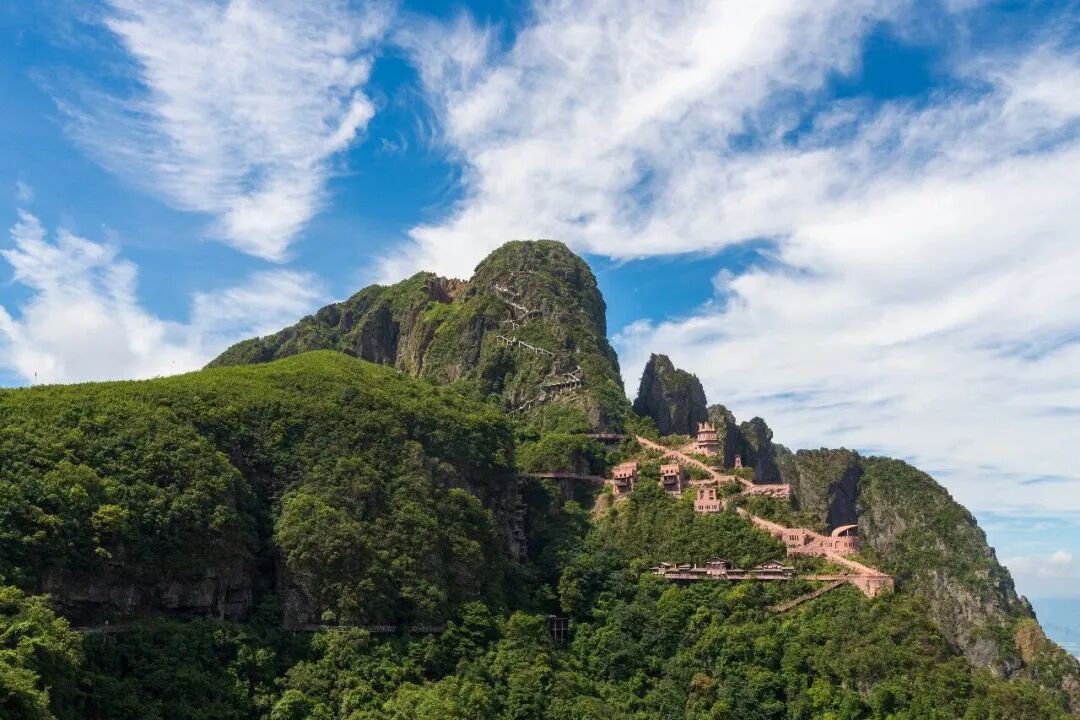 贵港的山水,更有诗意之韵。 西北部的岩溶峰林,三三两两地散布在平原之上。北帝山素有“广西张家界”之称,悬崖栈道蜿蜒其间,石林如剑戟挺立,登顶可邂逅云海翻涌,感受“会当凌绝顶,一览众山小”的豪迈。 千年古刹南山寺藏在峰峦叠翠中,门前的石阶被岁月和游客的脚步磨得光滑。春日,山寺桃花盛开,灼灼其华与古塔飞檐相映成趣,禅意顿生。桂平西山,作为岭南著名佛教圣地,晨钟暮鼓与山间清风交织,亦是登高揽胜、休闲探险的好去处。