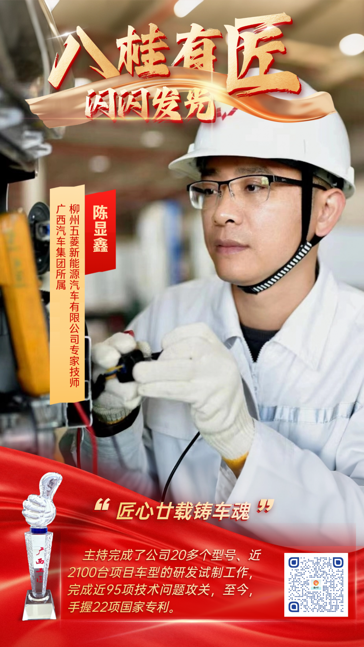 制作:梁菁惠 素材来源:广西汽车集团 2005年夏天,一个意气风发的年轻小伙走进五菱集团(广西汽车集团前身)的大门。彼时没人会想到,这位年轻人会在之后的二十年间,成长为享受国务院政府特殊津贴的整车试制大师,手握22项国家专利,成为当代知识型高技能型工人队伍中的杰出代表。 他就是广西汽车集团旗下柳州五菱新能源汽车有限公司专家技师,陈显鑫。